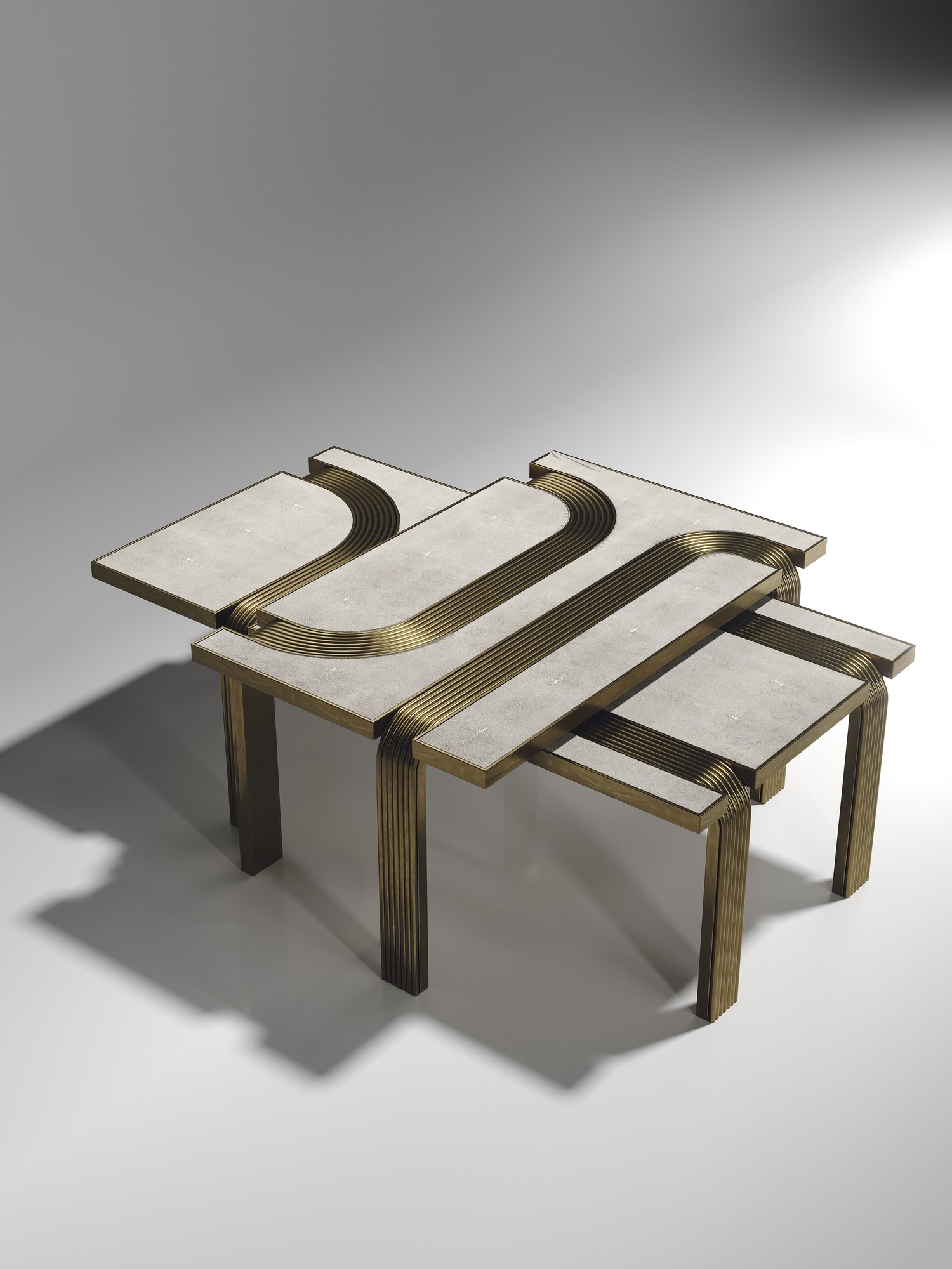 The Set of 2 Licol Nesting Coffee Tables by R & Y Augousti explore the brand's iconic DNA of bringing old world artisanal craft into a contemporary and utterly luxury feel. These tables are done in different finish variations including shagreen and pen shell with bronze-patina brass accents, and inlay mixed with rattan. Custom sizing/finishing on request.