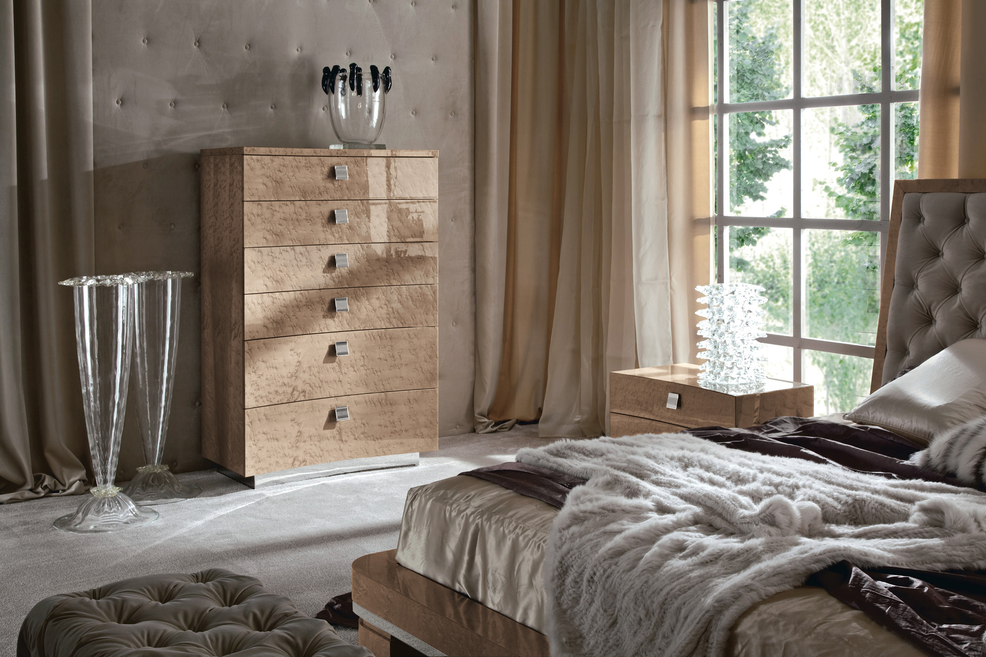 Chest available in high gloss polyester champagne bird’s eye maple veneer. Chrome stainless steel handles and base.