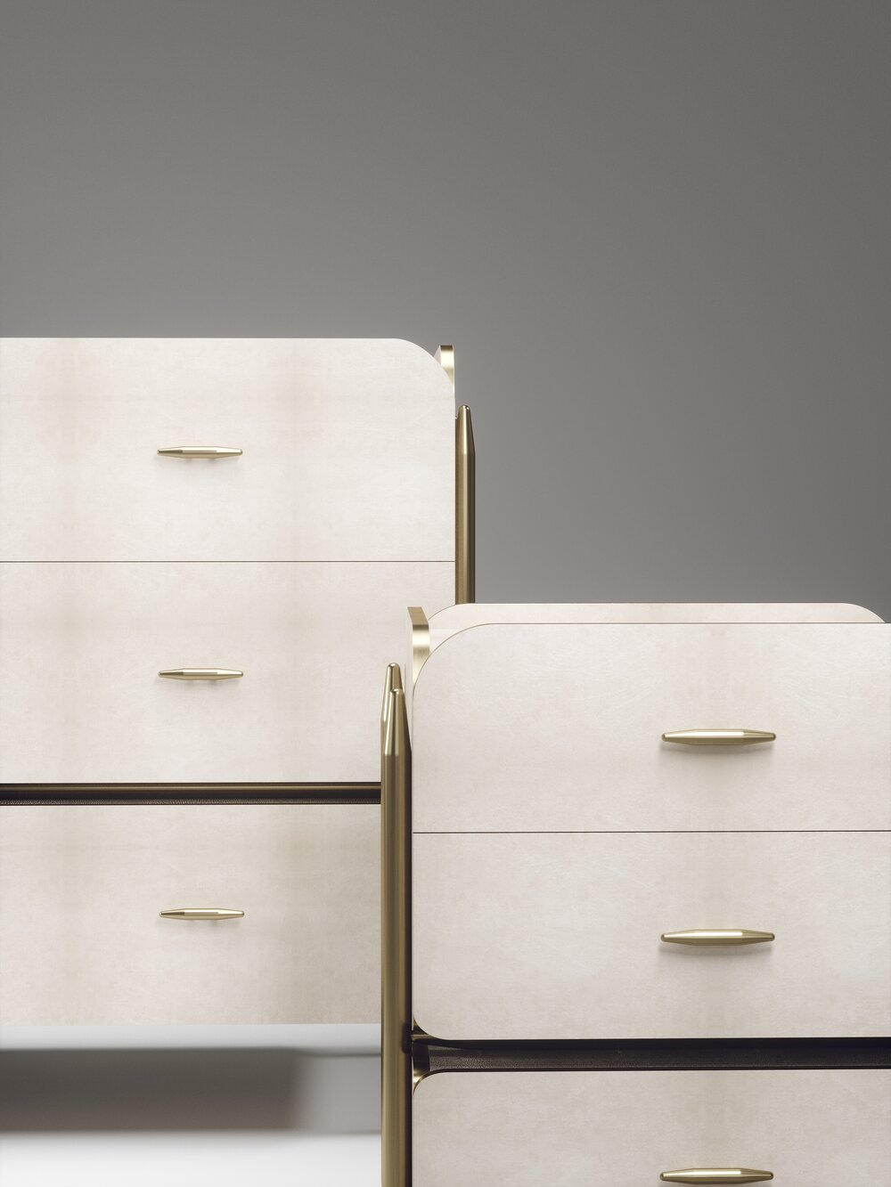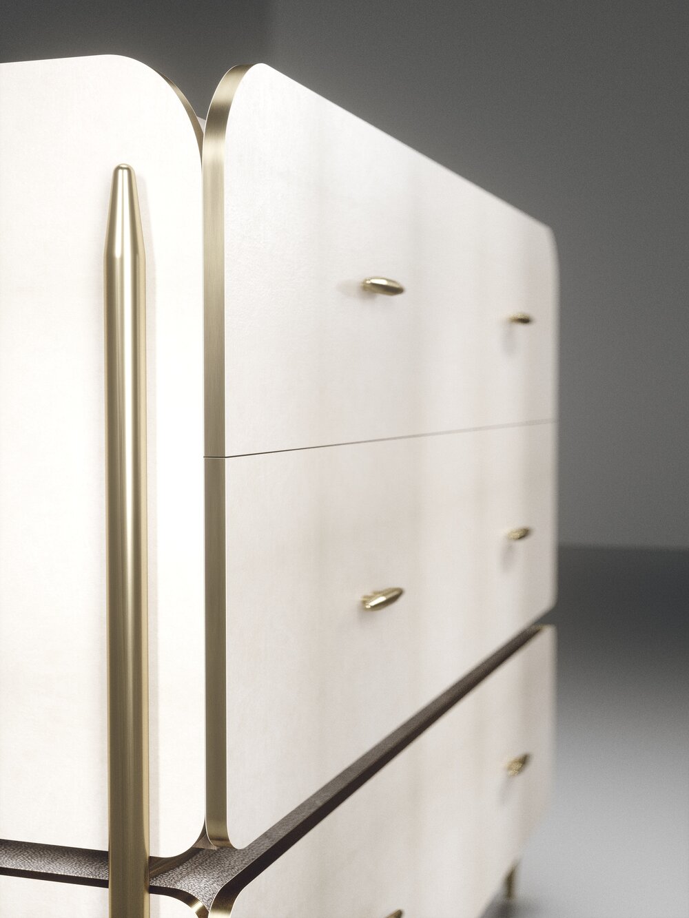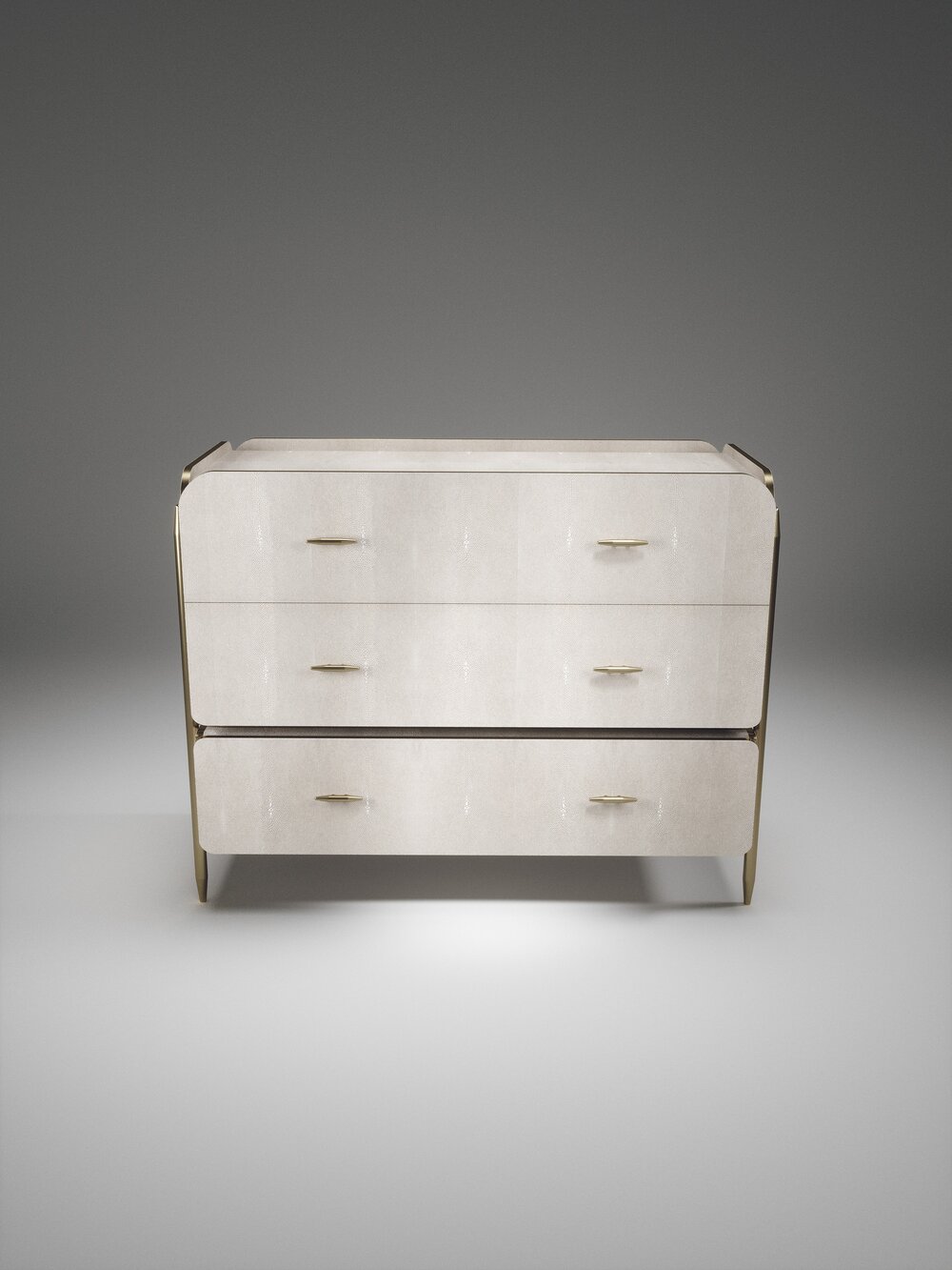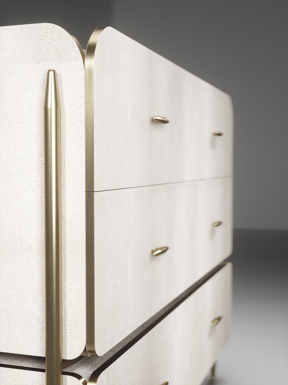 The Dandy Rectangle Chest of Drawers by Kifu Paris is an elegant and a luxurious home accent, inlaid in cream shagreen with bronze-patina brass details. This piece includes 3 drawers total and the interiors are inlaid in gemelina wood veneer. The back of the piece is inlaid in wood veneer, or in shagreen. Available in light grey and as an oval version and as a bedside table. This piece is designed by Kifu Augousti, the daughter of Ria and Yiouri Augousti.
