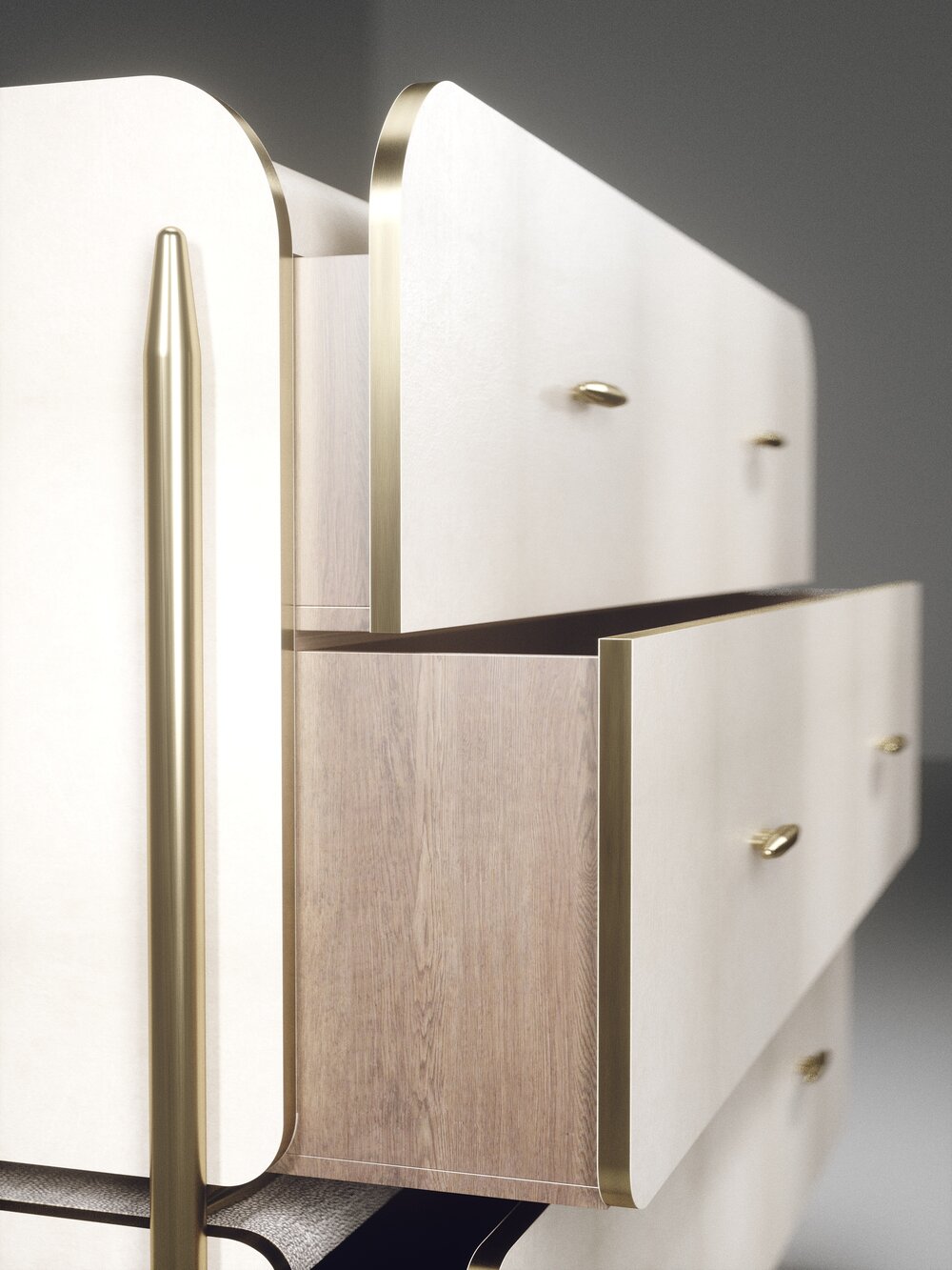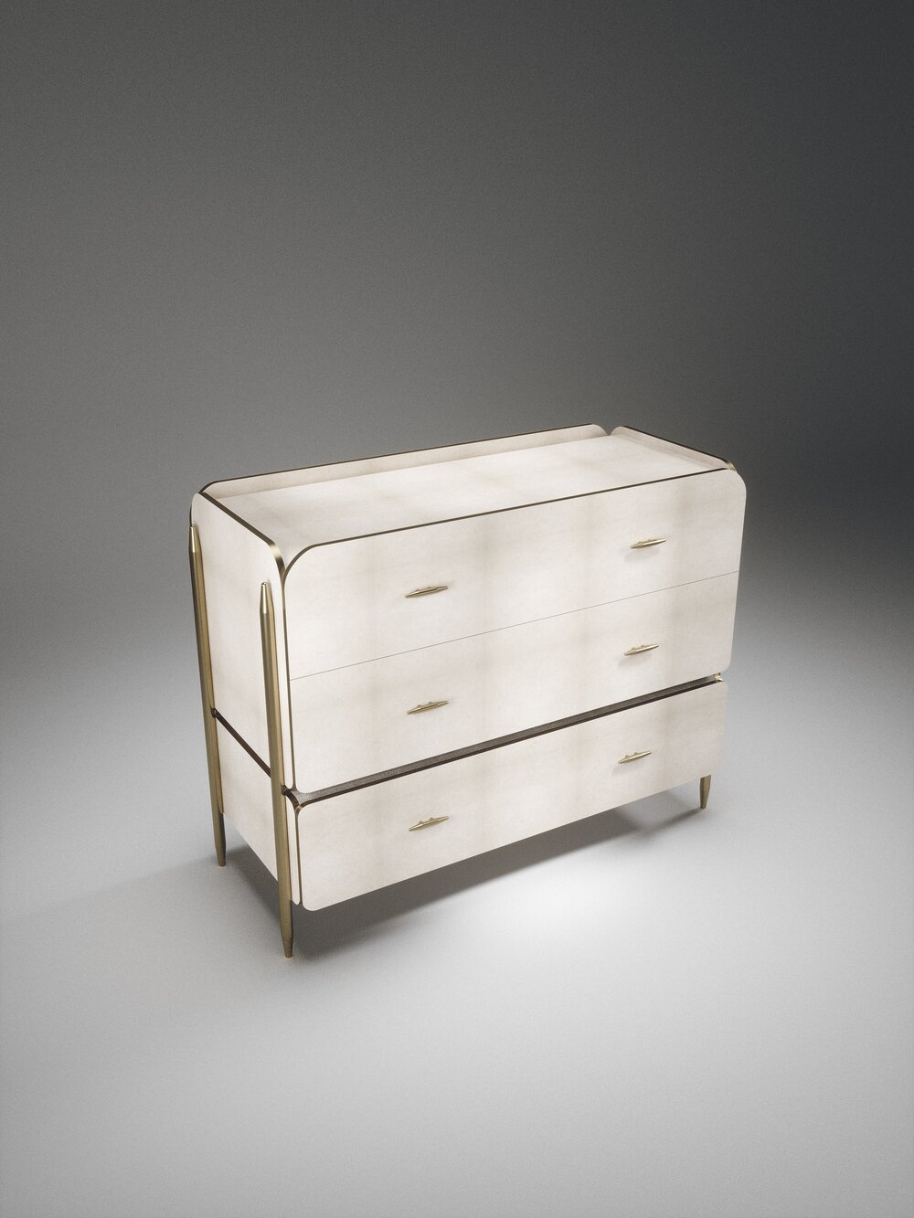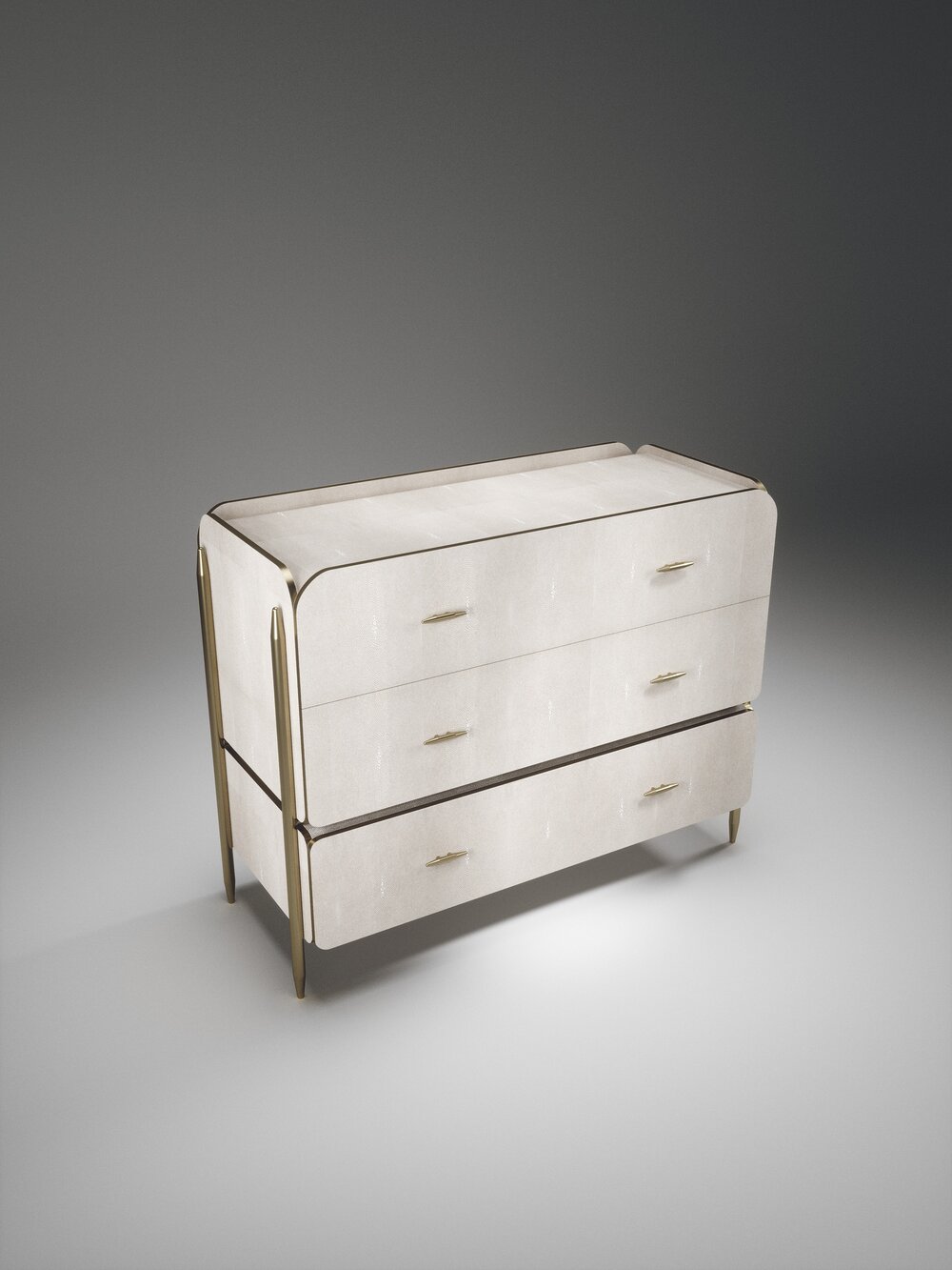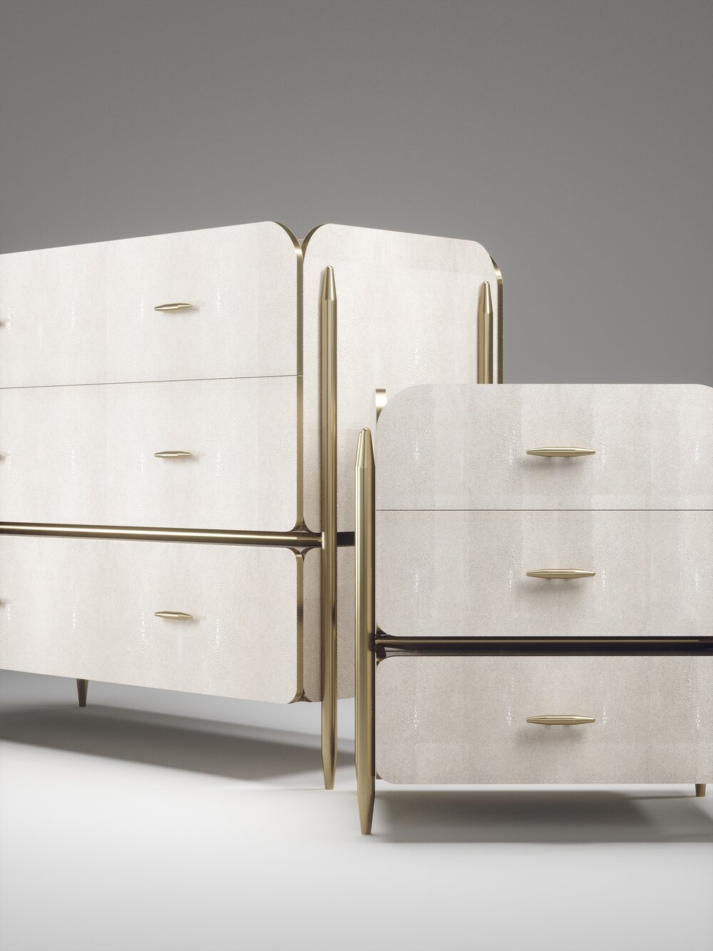 The Dandy Rectangle Chest of Drawers by Kifu Paris is an elegant and a luxurious home accent, inlaid in cream shagreen with bronze-patina brass details. This piece includes 3 drawers total and the interiors are inlaid in gemelina wood veneer. The back of the piece is inlaid in wood veneer, or in shagreen. Available in light grey and as an oval version and as a bedside table. This piece is designed by Kifu Augousti, the daughter of Ria and Yiouri Augousti.