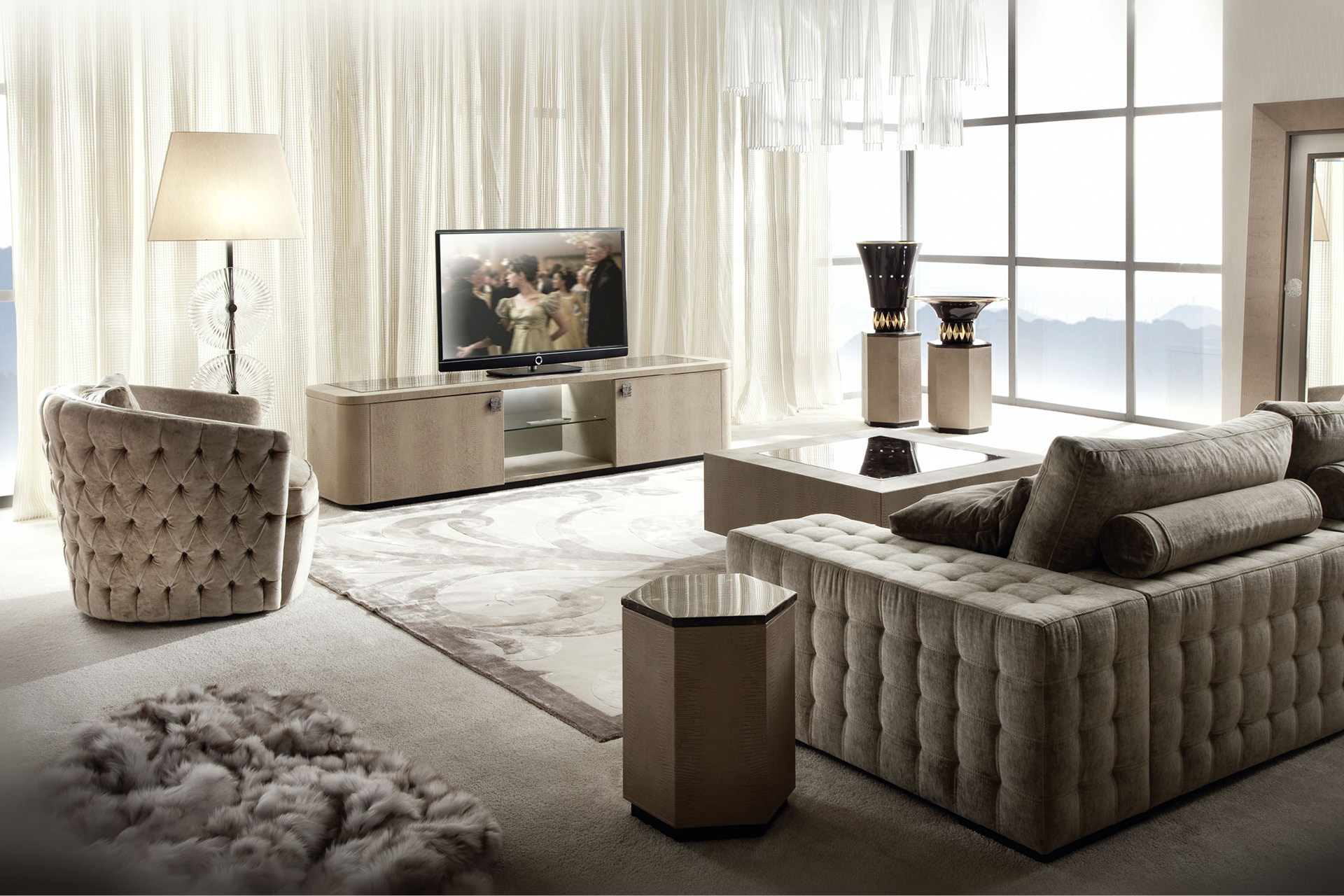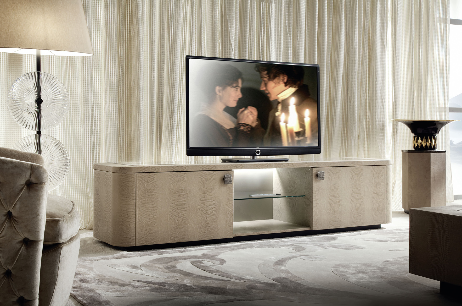 Base for plasma T.V. unit in armadillo printed leather with brown emperador marble top insert. 2 doors and 1 open space w/ glass shelf with led light. Base, details and handles in bronze brass