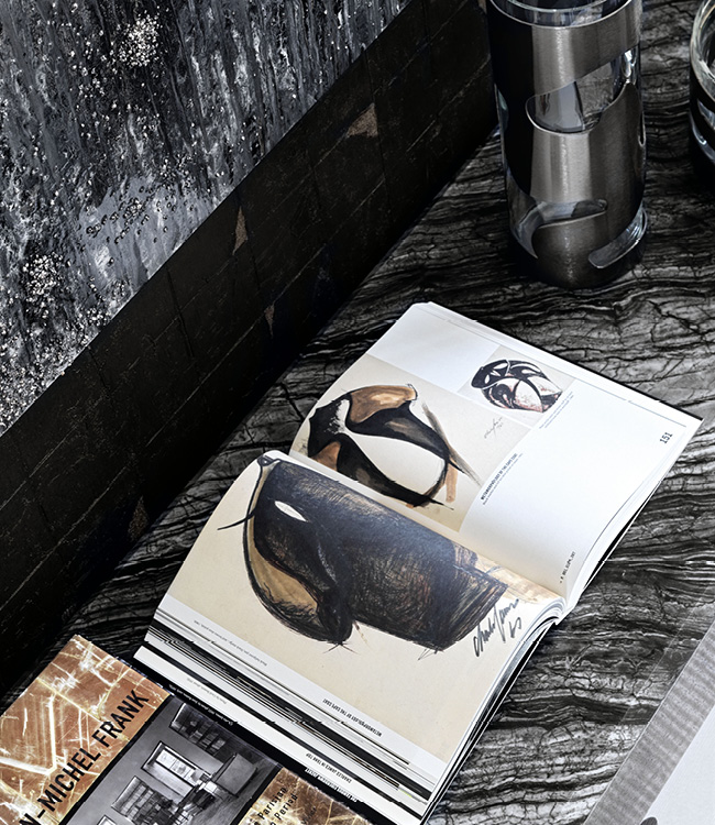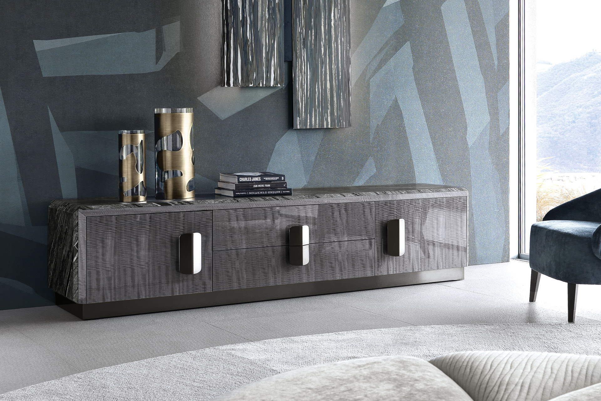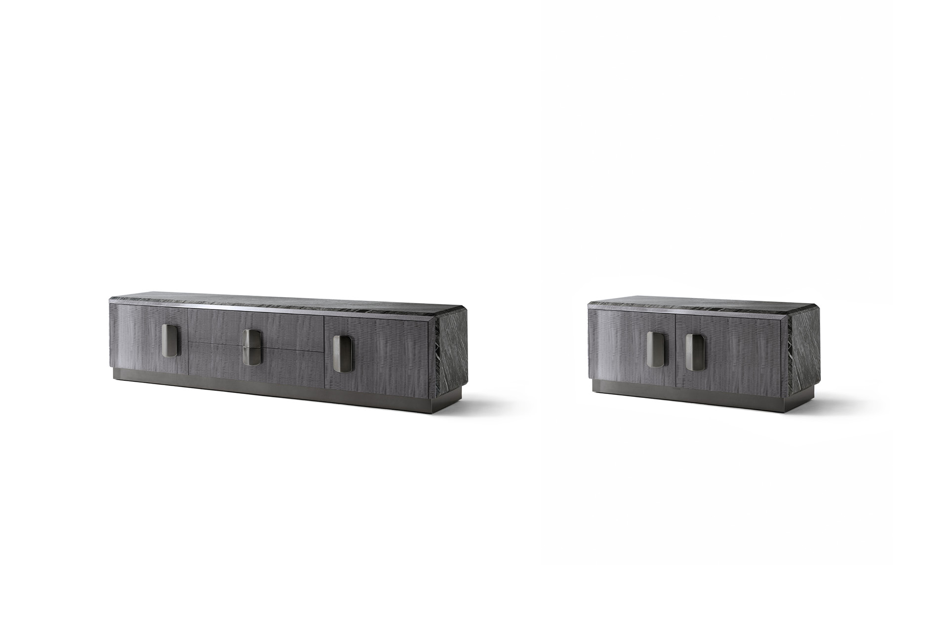 Base for TV unit in Madagascar figured Mowinghi veneer with high gloss polyester finish. 4 handles and base in satin black nickel stainless steel. Top and sides in Black Kenya marble.