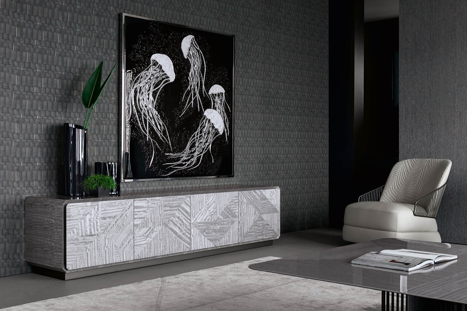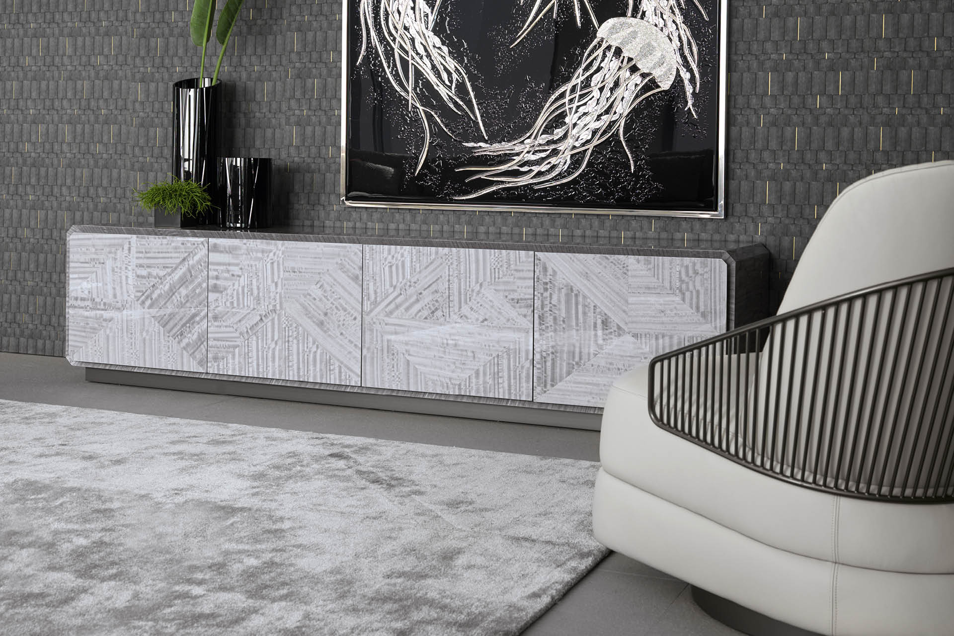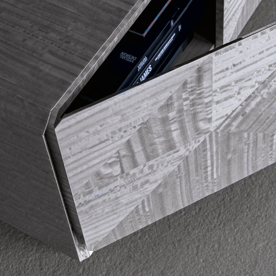 Base for TV unit in Tasmanian curly Eucaliptus veneer with high gloss polyester finish. 4 inlaid doors with 3 inside tempered glass shelves. Base in satin grey nickel stainless steel.