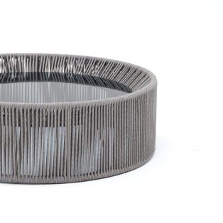 An elegant handmade synthetic rope weave covers the structure of the Tibidabo table with vertical lines, giving shape to a light design accessory with a strong personality, perfect for decorating the home garden or the poolside of hotels and spas.