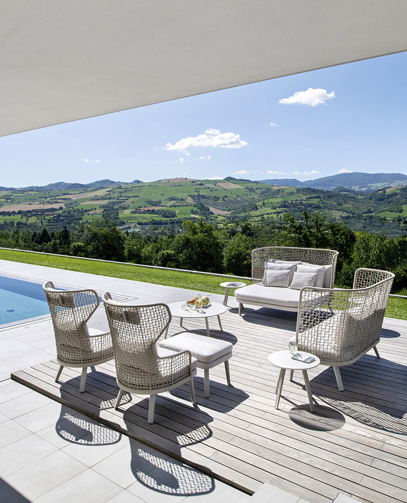 Emma daybed with high backrest combines the relaxation of the sun lounger with the conviviality of the sofa, creating a unique outdoor piece of furniture. The hand-woven backrest is the motif that most characterizes the design of this daybed, a delicate surface where you can rest comfortably and find peace, as well as shelter from the wind and sunlight. Ideal for both residential and contract spaces, the Emma high-back daybed furnishes with style, giving personality to the outdoors.
