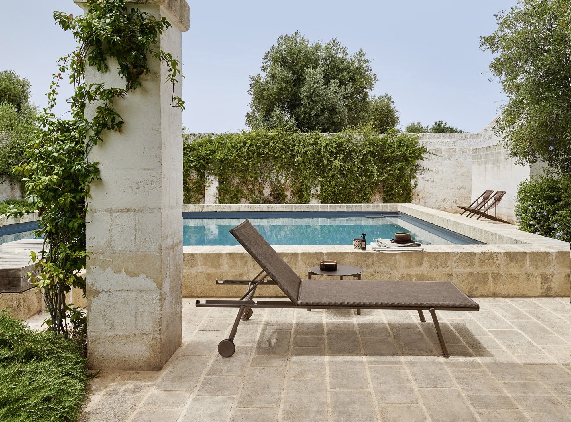 Bahia is a light and handy sunbed, perfect for the beach or swimming pool. Its essential design is embellished with small details that soften the rigorous lines of the structure, such as the circular section of the legs which is revealed on the side of the seat. The version with wheels and cushion allows greater ease of movement for these sunbeds which, when not in use, can be stacked in groups of ten and stored.
