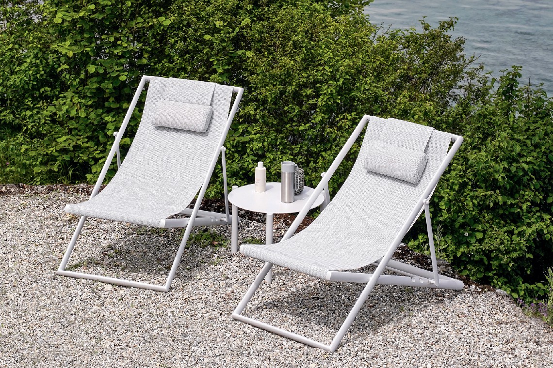 Seating comfortably in the Clever foldable deckchair means experiencing the outdoors in harmony with nature. Seat and backrest are in VAR#TEX, a technical PVC fabric easy to clean, weatherproof and UV light resistant.