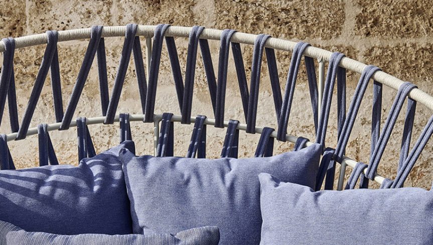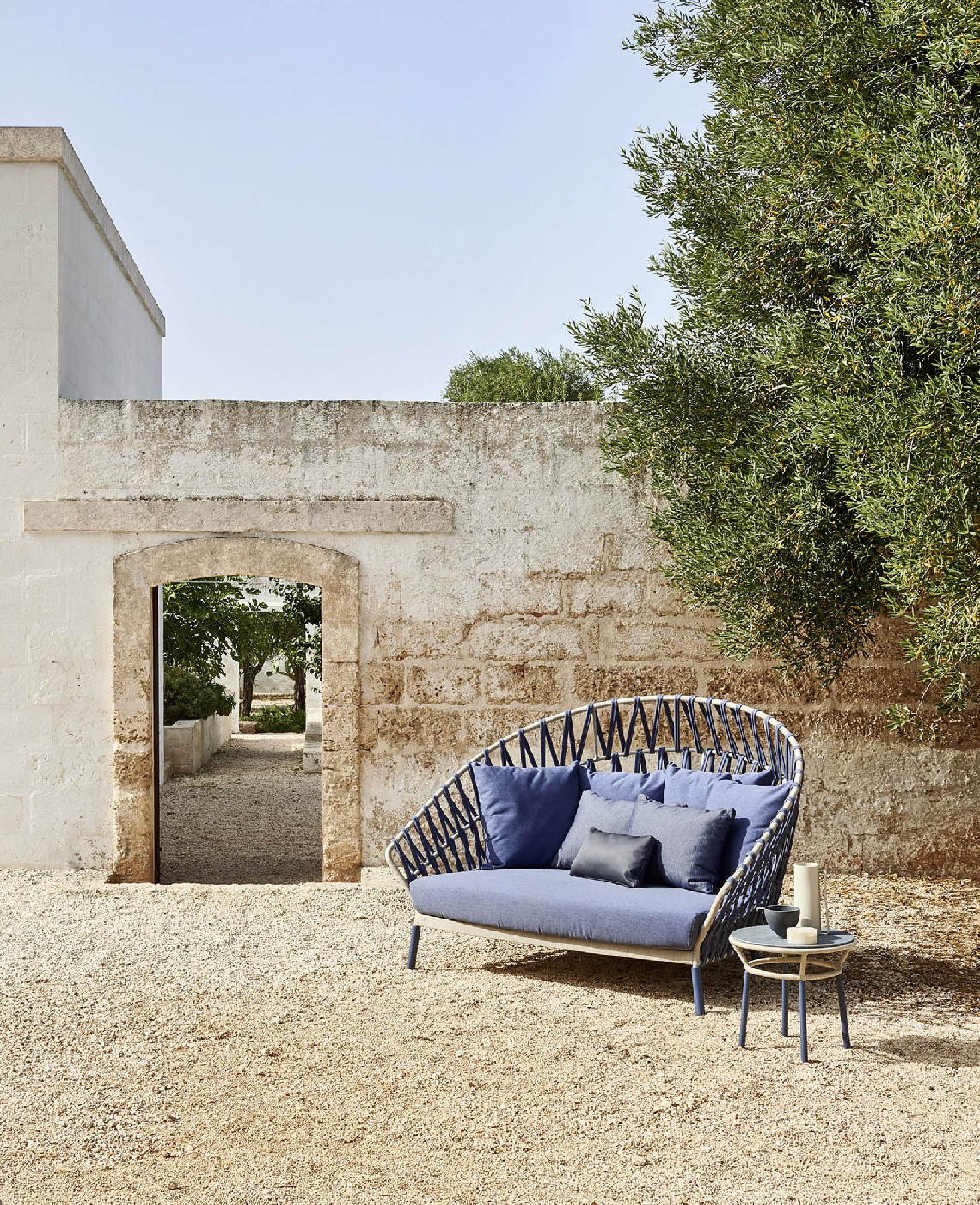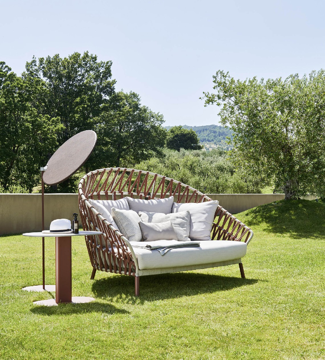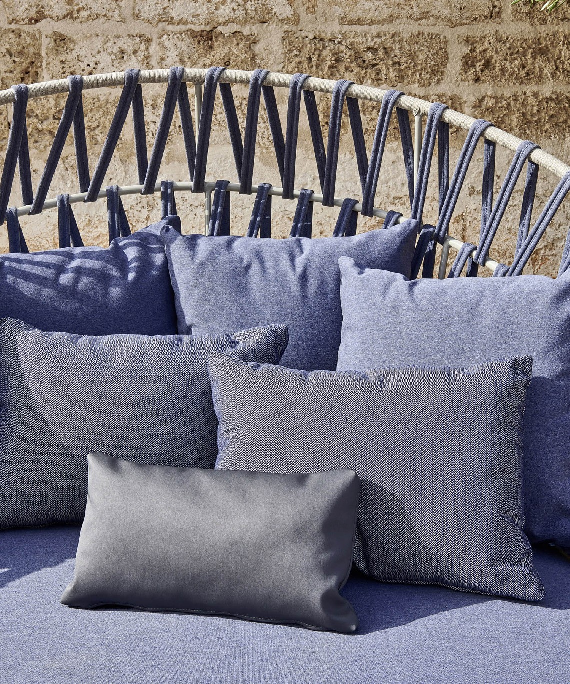 The idea of sofa meets the bed: and here is daybed. The one from the Emma Cross collection stands out for the shape, decidedly cocooning thanks to the backrest-armrests combination, distinguished by the weaving, handmade in acrylic fabric Band, on a powder-coated aluminium frame. The seat cushion with Dryfeel? foam padding, suitable for outdoor use, and the 7 back cushions are included.