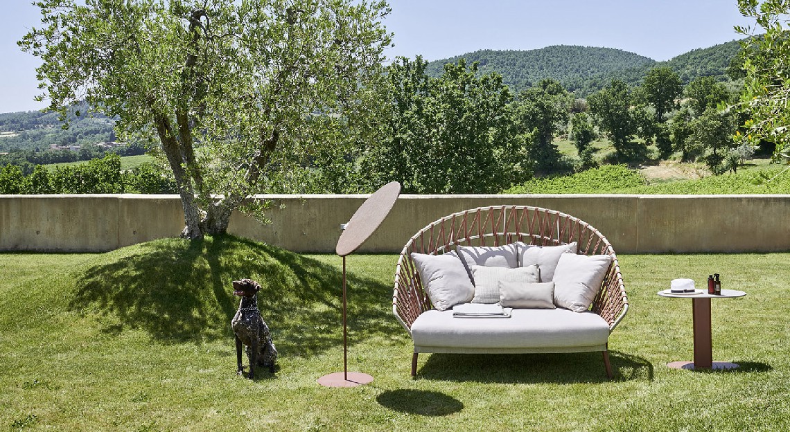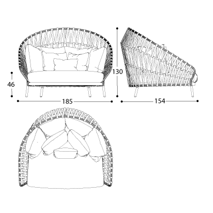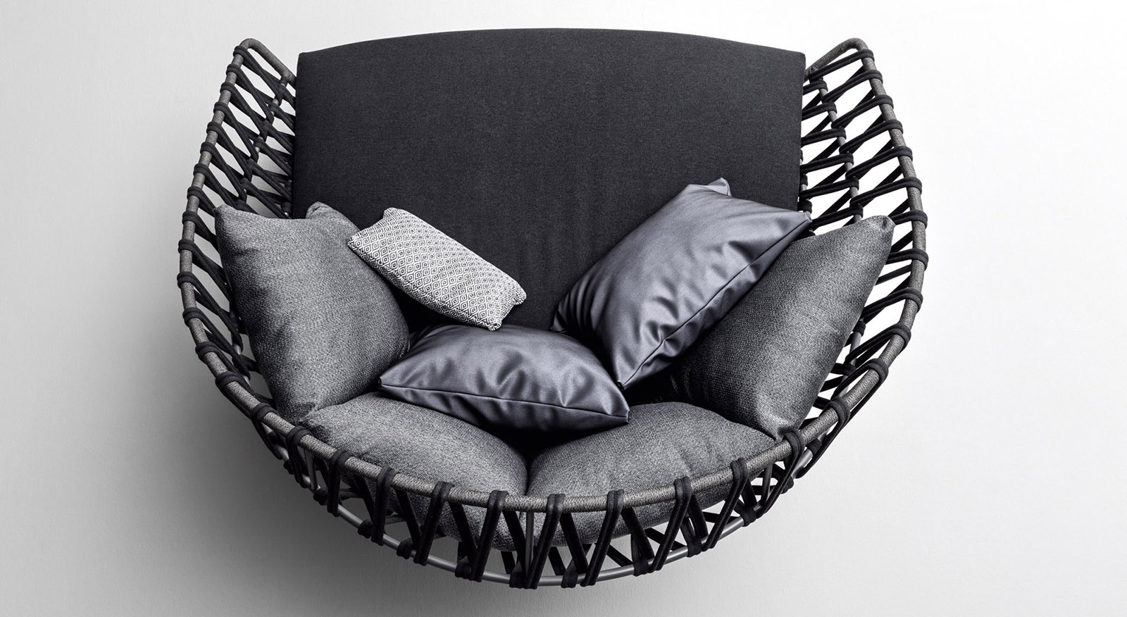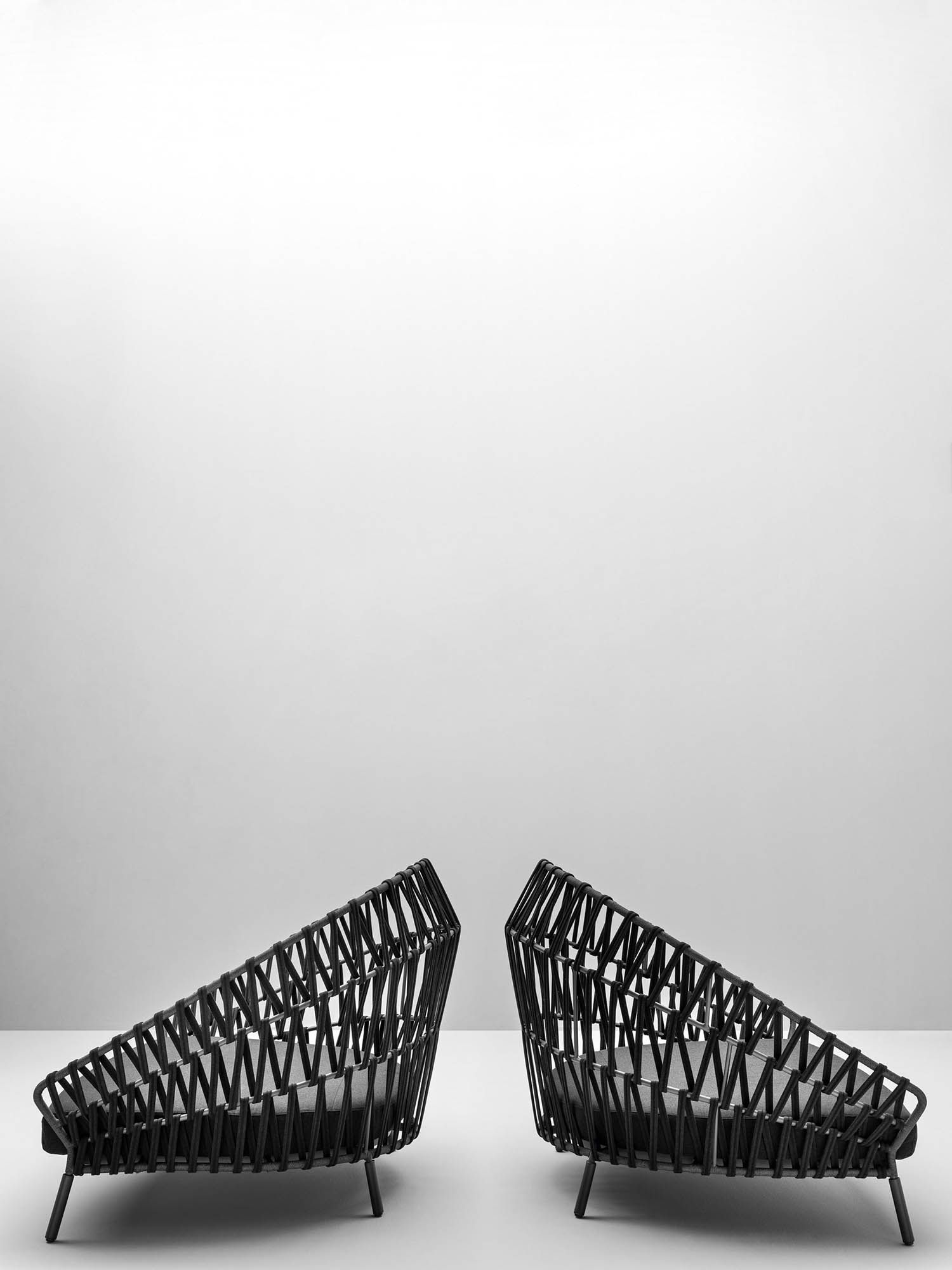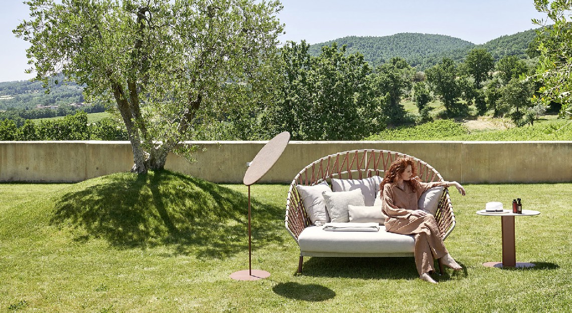 The idea of sofa meets the bed: and here is daybed. The one from the Emma Cross collection stands out for the shape, decidedly cocooning thanks to the backrest-armrests combination, distinguished by the weaving, handmade in acrylic fabric Band, on a powder-coated aluminium frame. The seat cushion with Dryfeel? foam padding, suitable for outdoor use, and the 7 back cushions are included.