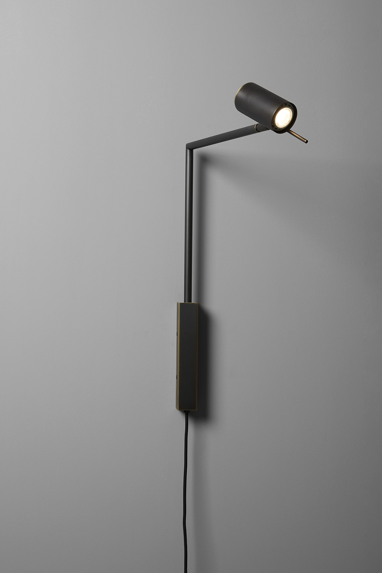 Wall lamp with directional light. Dark burnished brass or matte black nickel and polished black nickel structure and adjustable joint.
