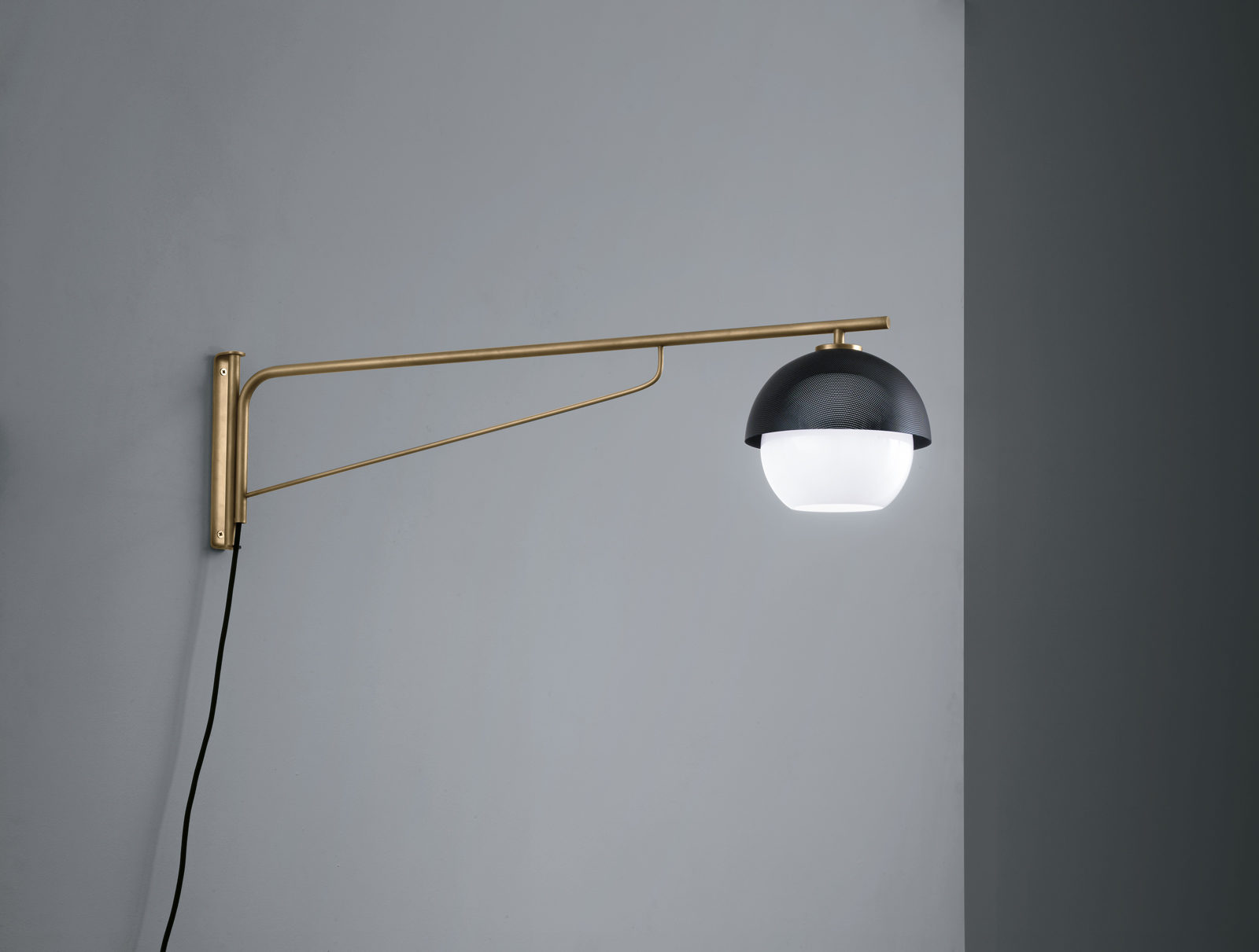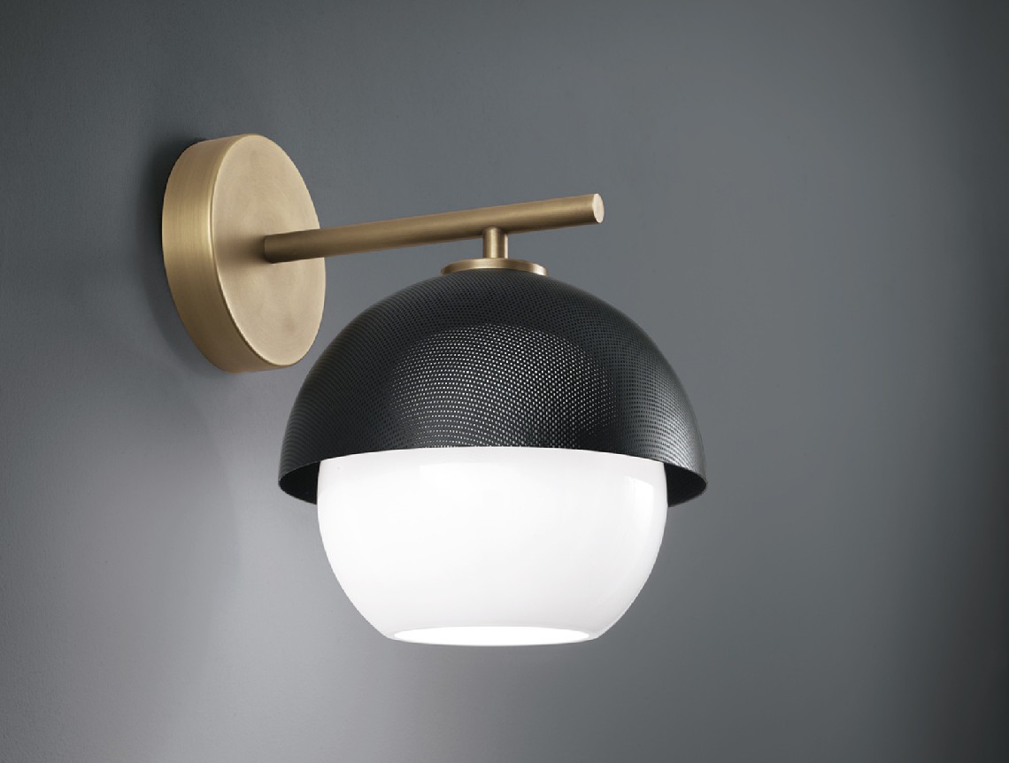 Wall lamp with diffused light. Light or dark burnished brass structure with matte gold or matte black perforated metal lampshade. White Murano blown glass diffuser.