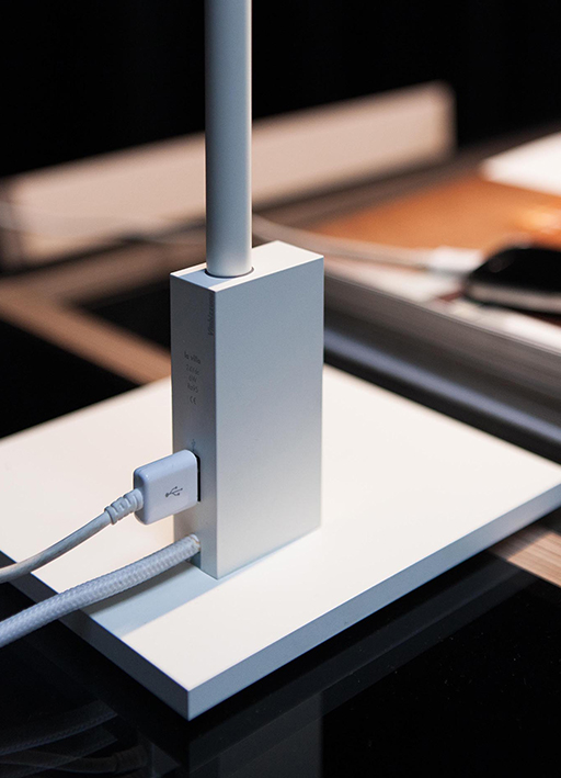dry location rated table lamp for indoor use. made of powder coated oxidized extruded aluminium profile. consisting of a tubular profile diameter ?13mm/0.5’’ h.508x500mm/20x19.7’’, adjustable by 300° on the horizontal axis and by 300° on the vertical axis, fixed on a 160x160x8mm/6.3x6.3x0.3’’ base through a rectangular support containing on/off touch sensor and usb port. wired with a 3000K Ra95 7.2W 780lm linear led source, equipped with extruded frosted polycarbonate diffuser. 120V 50-60Hz power supply with plug included, with 2000mm/78.7’’ power cable. finishes: bianco V or nero55.