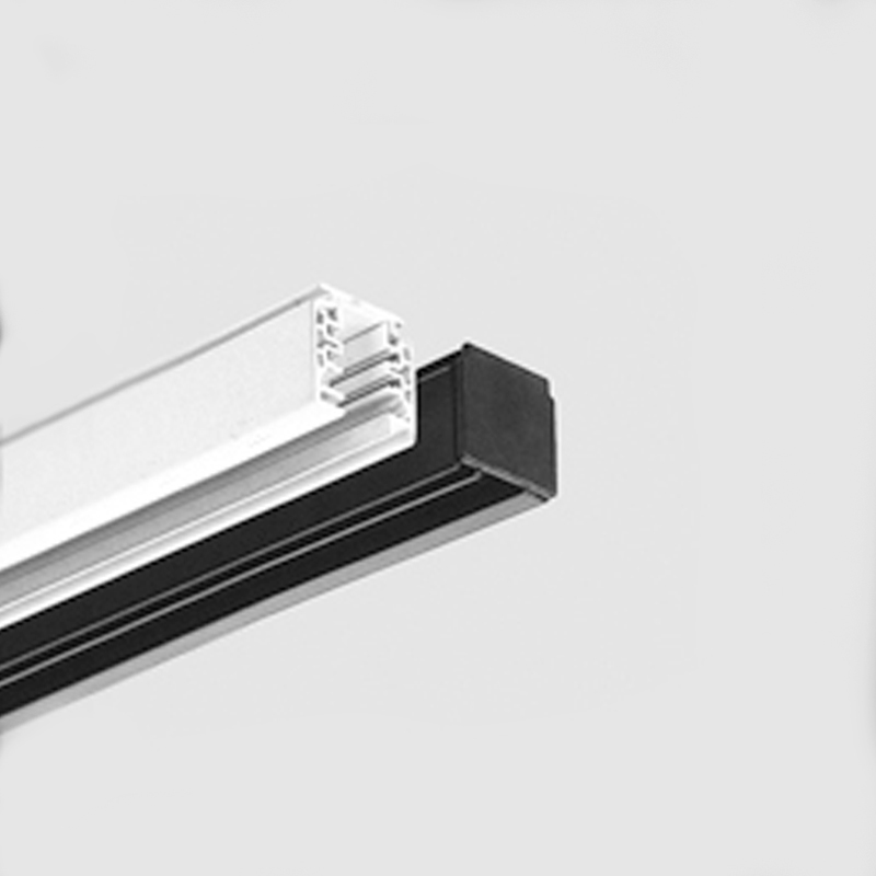 track system for indoor use. it consists of an extruded oxidised and powder coated aluminium having a 36x32mm/1.4”x1.3” section serving as an earth conductor and an insulating rubber insert that contains 4 copper conductors with a section of 2,5mm2/12awg. sizes: 1220mm/48”, 2440mm/96”, 3658mm/144”. supply voltage: 2~120V 50-60Hz up to 16A. accessories: left and right live end earth contact, lateral end cap, electrical straight coupler, curved joints, electrical straight coupler with feed, T-shaped joints, X-shaped joints, L-shaped joints, end caps. accessories: suspension steel cables. finishes: bianco V e nero55.