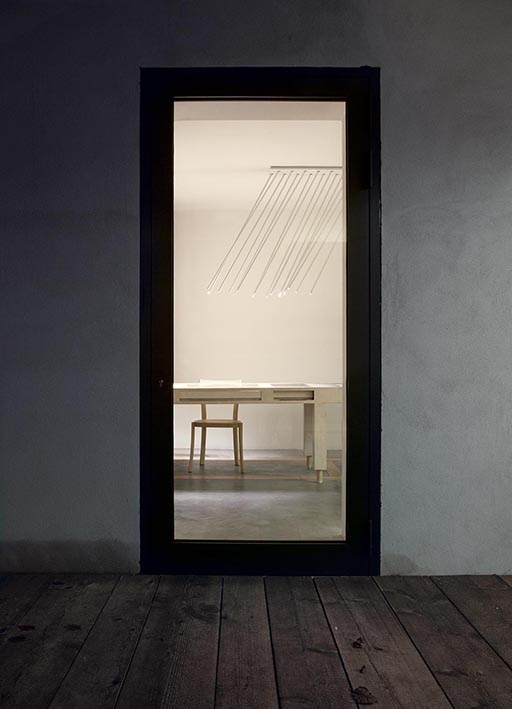 dry location rated ceiling light fitting for indoor use. made of extruded aluminium rods with a diameter 14mm/0.5’’ 1200mm/47.2’’ connected to a 170x170x40mm/6.7x6.7x1.6’’ steel support plate with a spherical joint that allows an inclination up to 30° on the vertical axis. versions: peled soffitto with 1 rod, peled soffitto with 4 rods, peled soffitto with 8 rods. wired with 3000K Ra98 1W led source. 120V 50-60Hz power supply included. accessories: joint, front plate for 1, 4, 8 and 16 rods. finishes: bianco V, polished black and polished stainless steel plate, aluminium rods painted in polished black