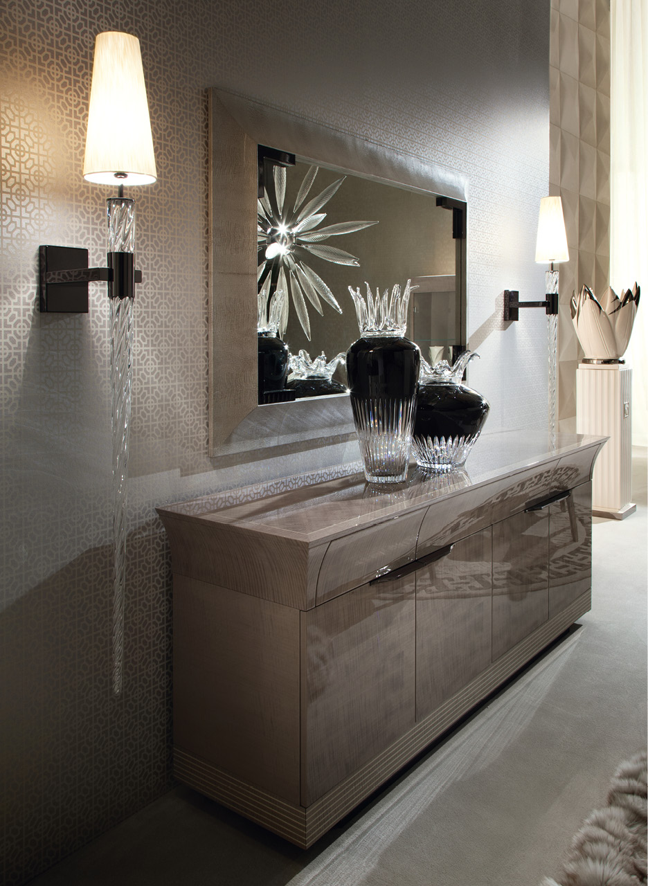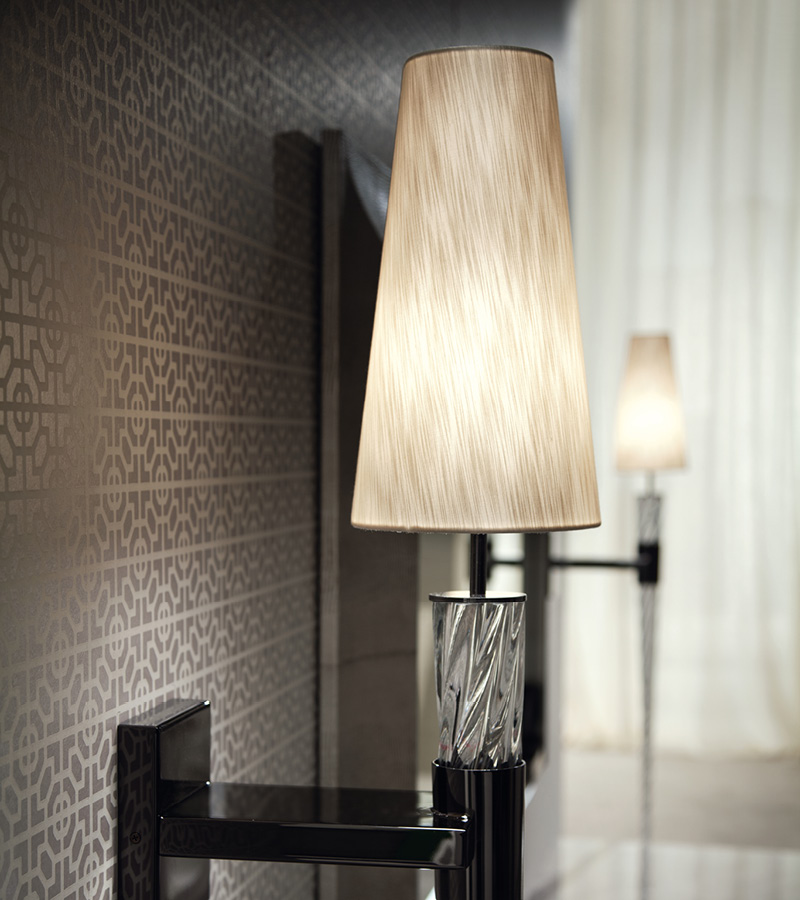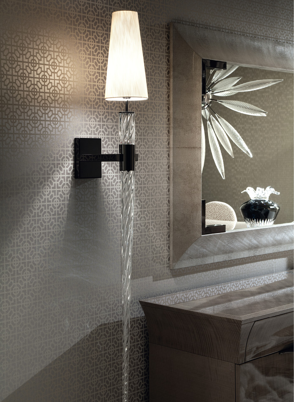 Wall ligth in combination of "Murano" blown glass and stainless steel in storm dark grey finish. Shade in beige silk.