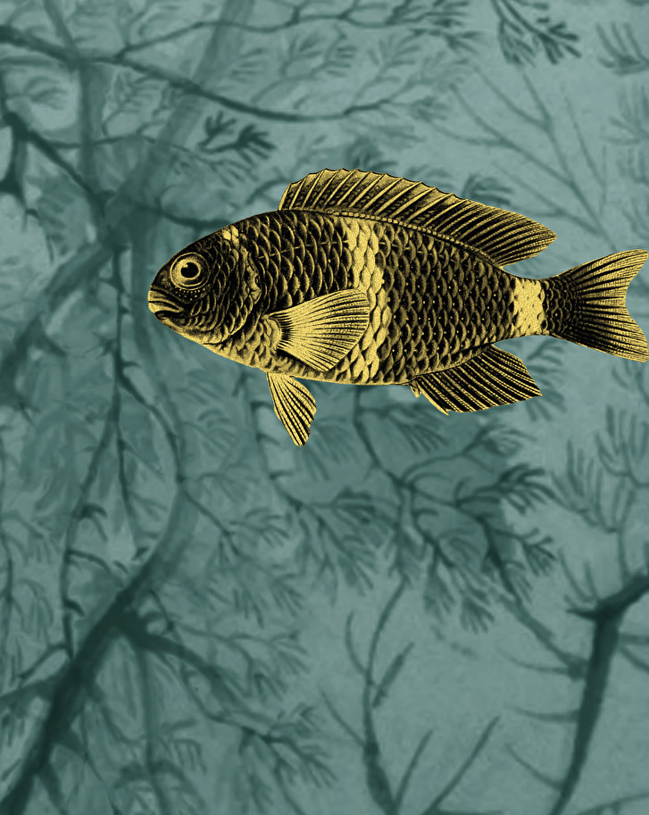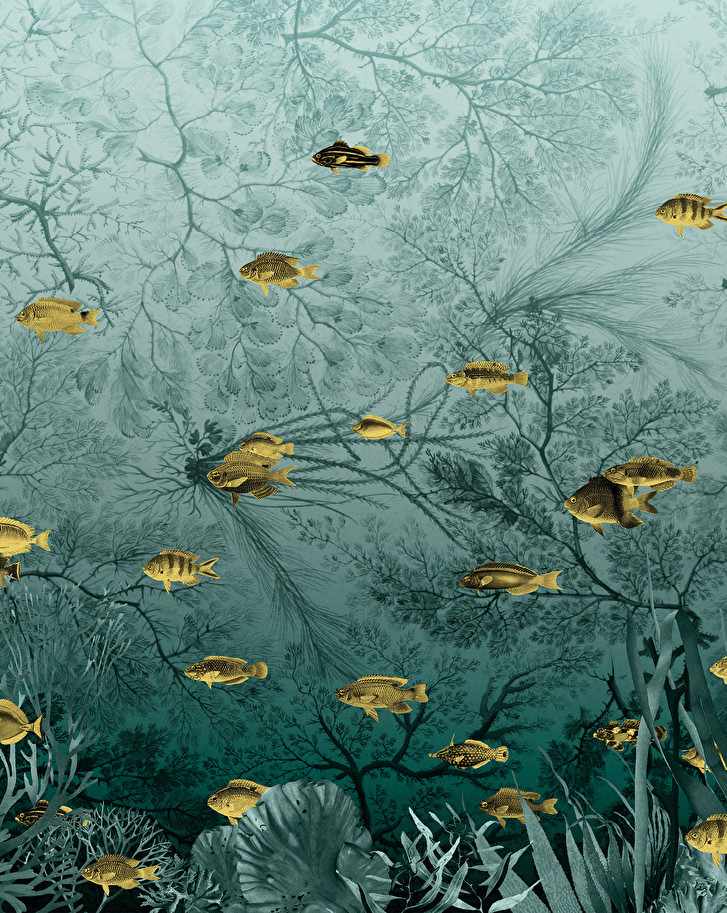 Wallpaper with a dreamlike atmosphere, imagined by Vito Nesta as a fantastic seabed populated by fishes. It is available in three chromatic variations.
