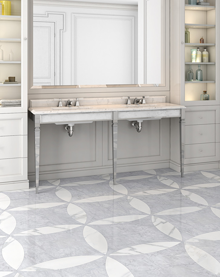 A console for double sink with linear design whose truncated pyramid legs, inspired by Art Deco, make this piece exclusive. The marble top, with veils, available in white Carrara, white Sivec, Black Marquinha marble or absolute black granite contains two large ceramic basins. Its legs are in aluminium and the frames are made of brass, with chrome, light gold or polished nickel finishes.