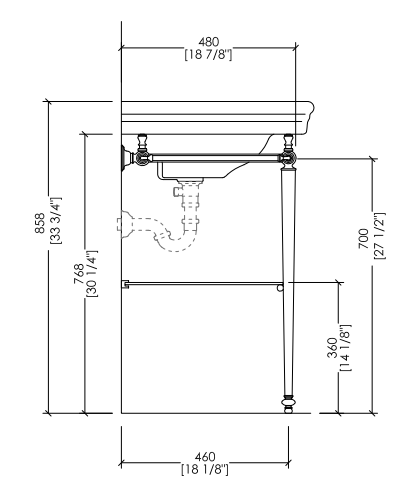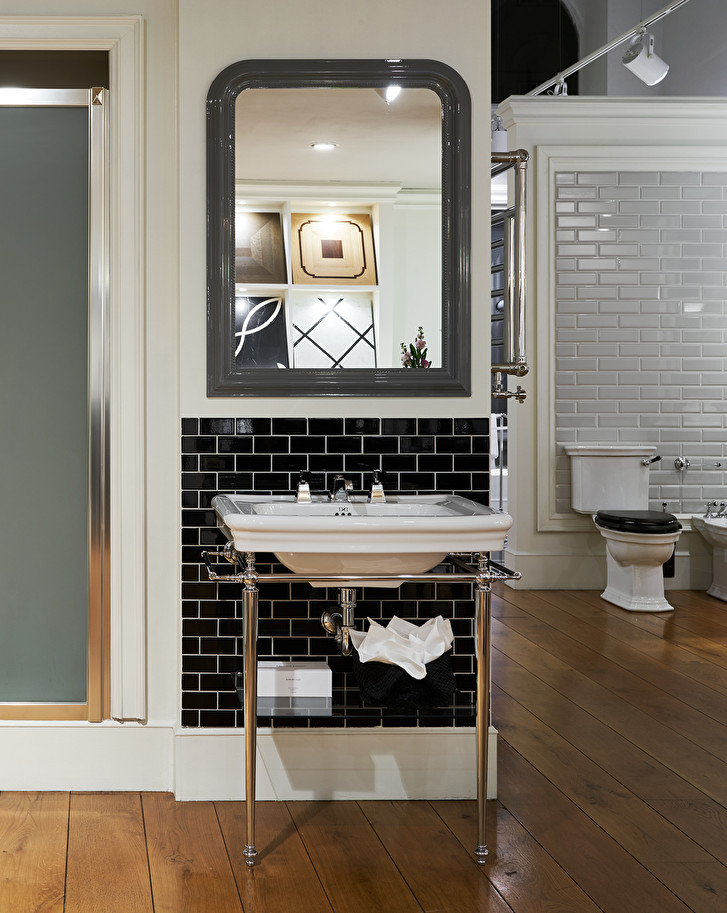 The quintessence of the classic style, conceived for the needs of space and practicality of the contemporary living. The refined English porcelain washbasin and the large glass shelf are supported by a turned brass structure, available in chrome, polished nickel or light gold finishes.