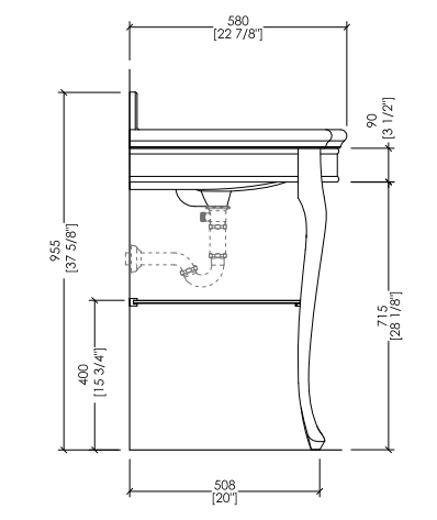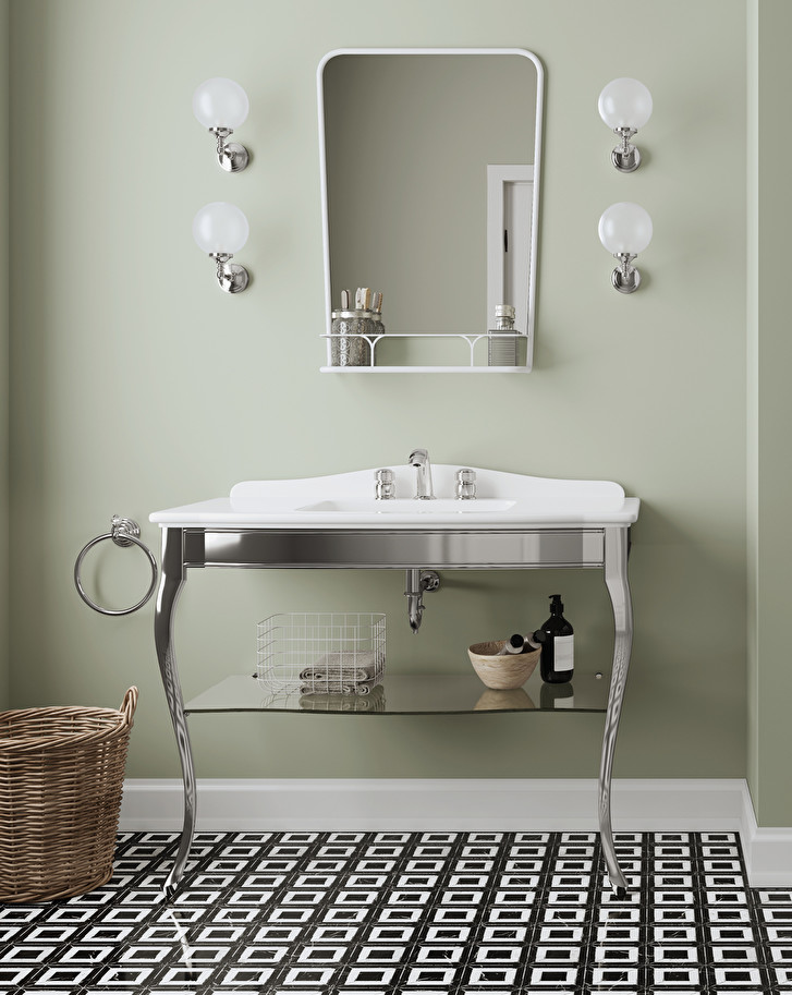 A classic-inspired console which reinterprets in a contemporary spirit an inspiration coming directly from the noble eighteenth-century houses. The top and basin are in ceramic, the shelf consists of transparent or smoke-grey glass. Its thin and sinuous legs are in fused-aluminium with chrome, light gold or polished nickel finishes.