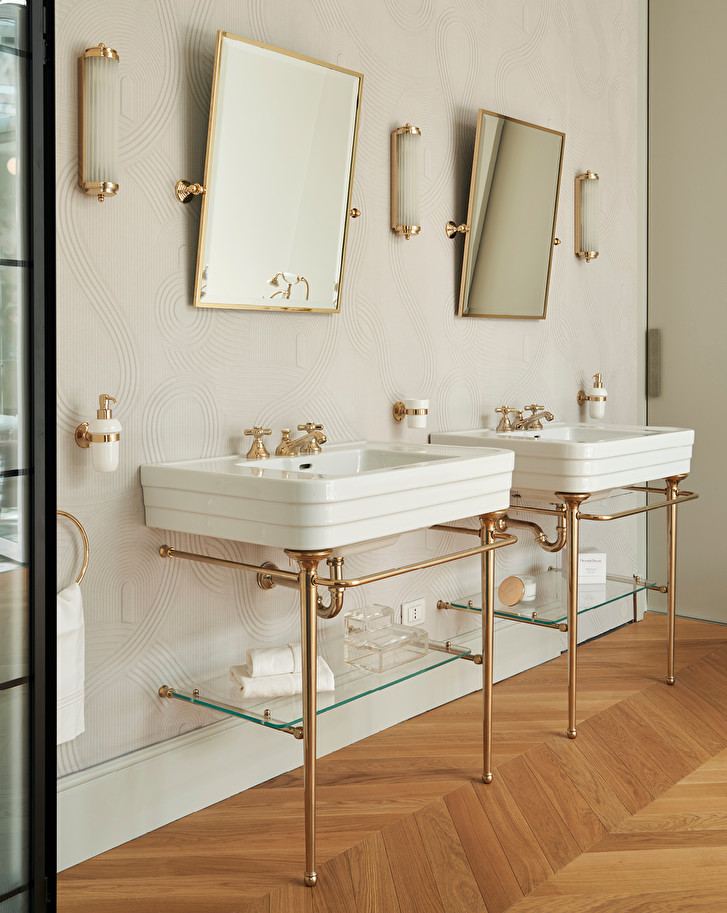 An elegant console that takes the essential beauty of Art Déco architecture and reinterprets this with a focus on the most exclusive comfort. The brass frame has a moulded base sculpted into three sections that evoke the sculptural shape of the ceramic washbasin, and includes three towel rails and a glass shelf. With a bespoke choice of finishes.