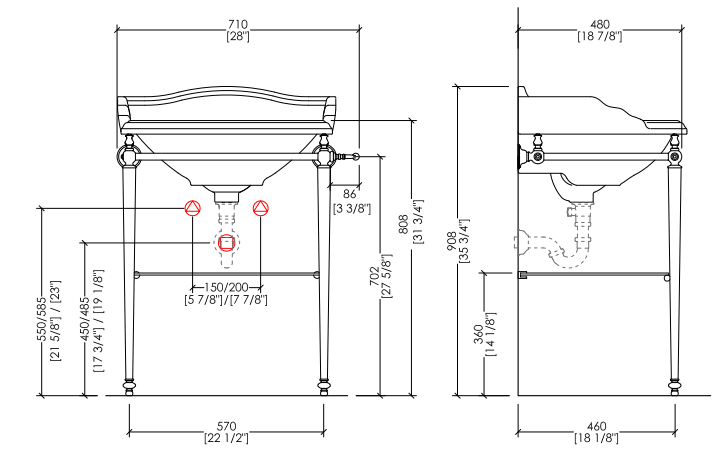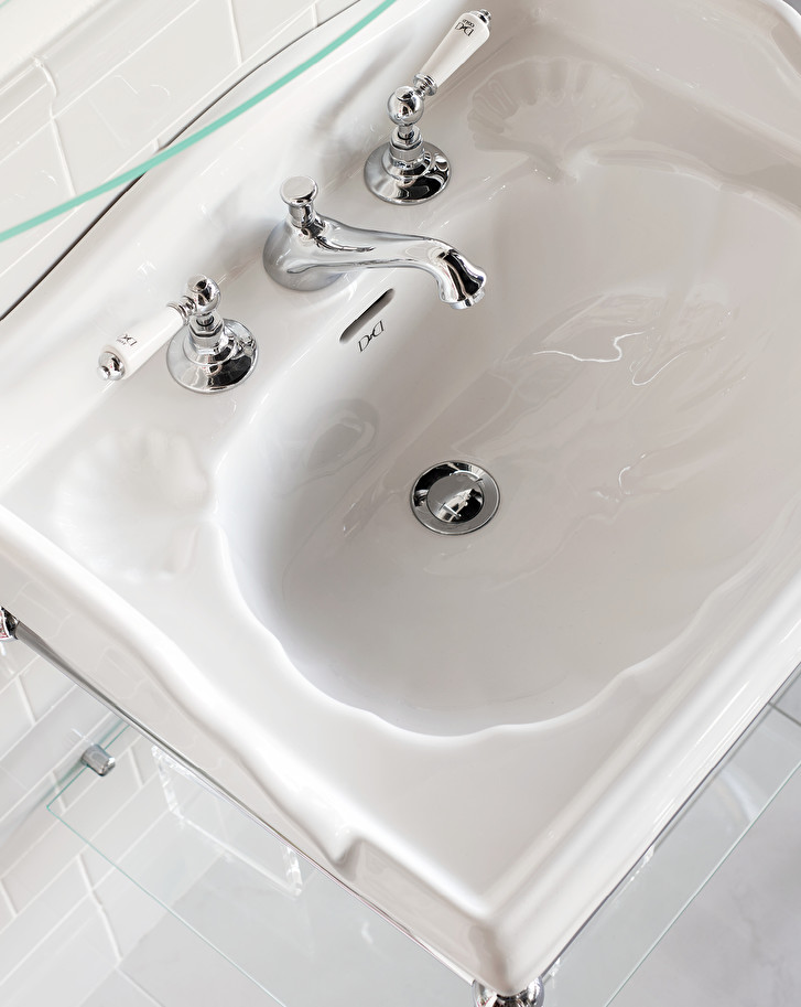 Bon ton atmposheres and elegance of bygone times are represented in a tubular metal structure, refined by the light tapered legs in turned brass, available in chrome, light gold or polished nickel finishes. This console is completed with the Cambridge ceramic basin, a towel rail and a glass shelf.