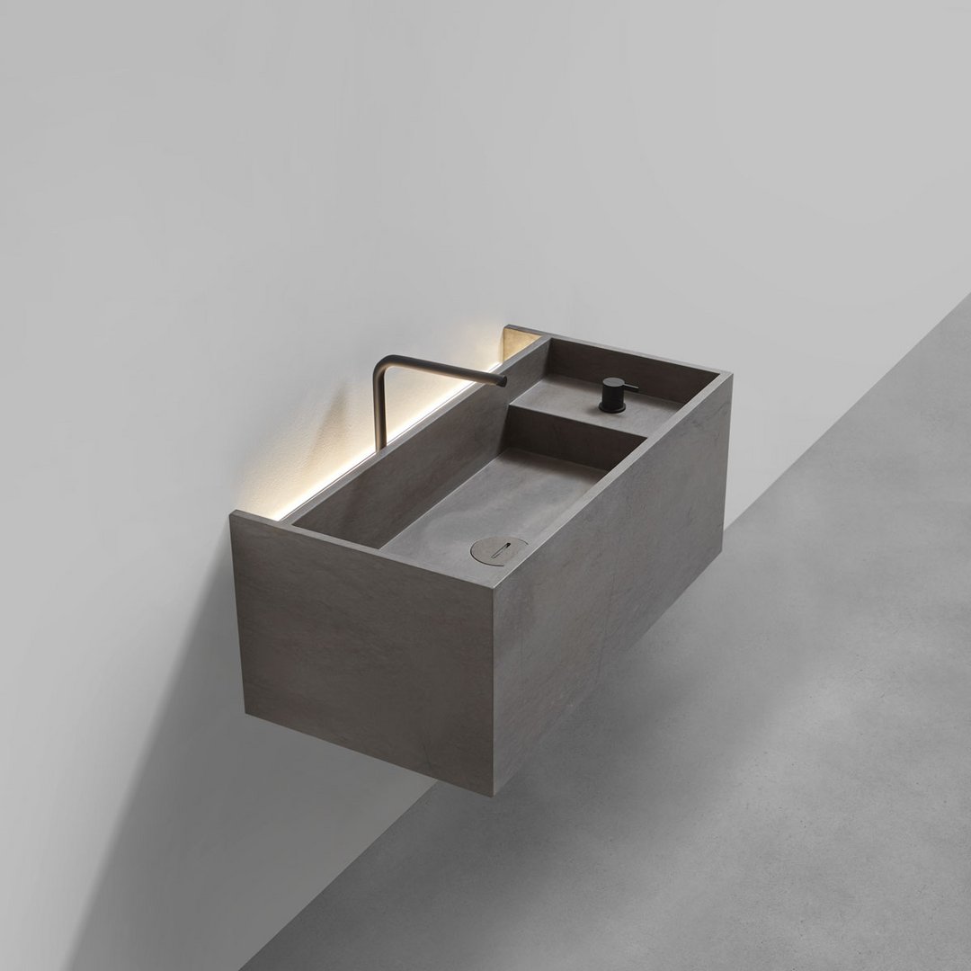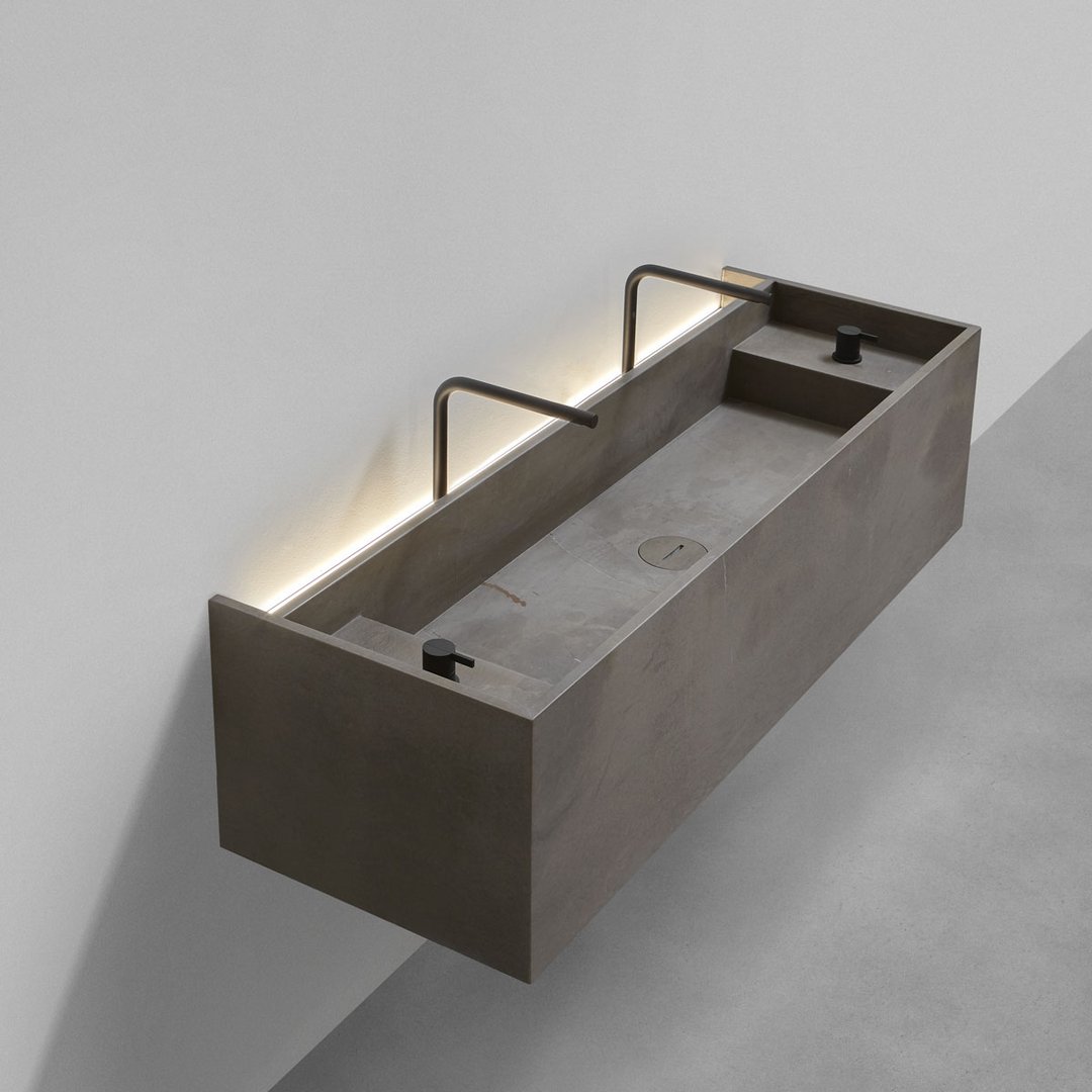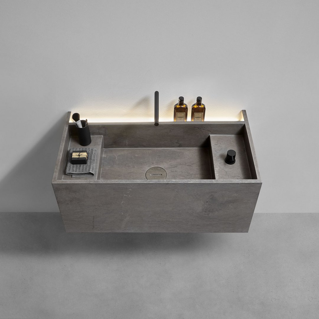 Le forme sono squadrate, le linee ortogonali disegnano geometrie pure e definiscono volumi con funzionalità diverse, lo spazio viene utilizzato al meglio grazie a proporzioni equilibrate, spessori sottili e altezze misurate. Le dimensioni disponibili e le combinazioni di configurazione rendono unico ogni lavabo. La pietra è la grande protagonista di questi monoliti, la forma di MyStreet nasce dalla conoscenza del materiale e dal lavoro dell’uomo per dargli una forma contemporanea. La collezione prende vita dalla serie di top già presentata da antoniolupi e proprio per questo oltre al bacino del lavaggio si predispone per contenere oggetti d’uso quotidiano che trovano posto in uno spazio dedicato e illuminato vicino alla parte.