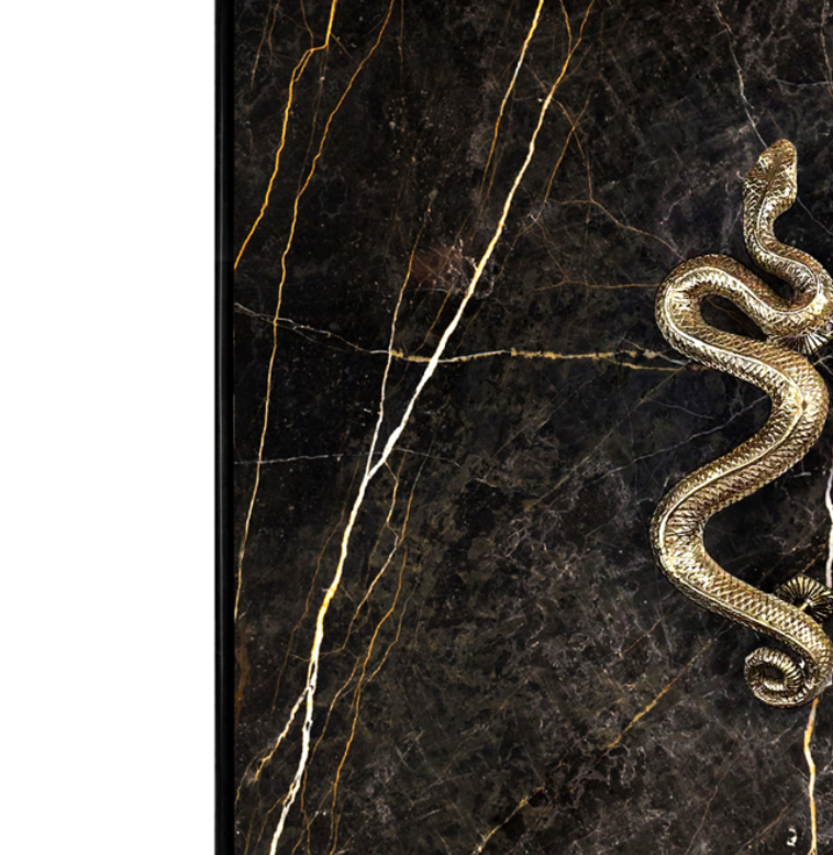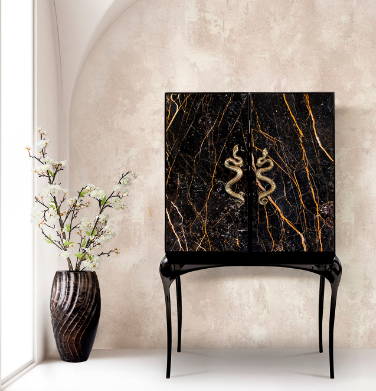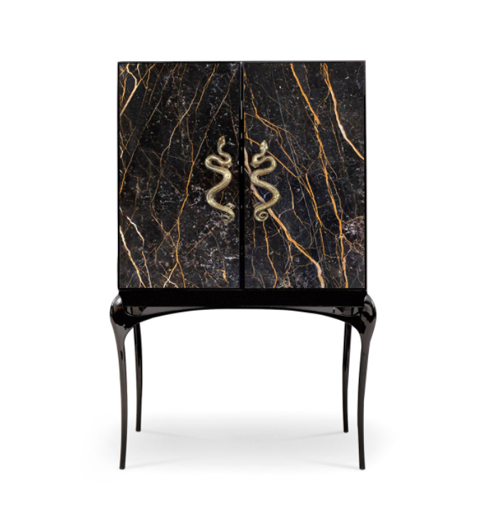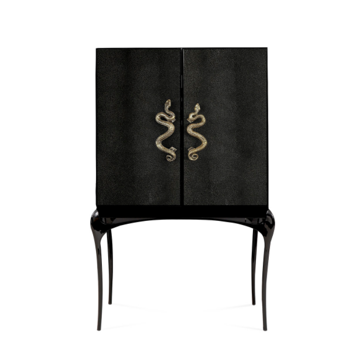 Inspired by the exotic allure of the South Asian country for which it is named after, the India Bar Cabinet at once mysteriously entices and induces a sense of warm comfort. Adorned with striking antique brass snake pulls, made using the ancient craft of sand-casting, India will make a statement in any setting. Open or closed, India is ready for a party or an erotic night in. Cheers!