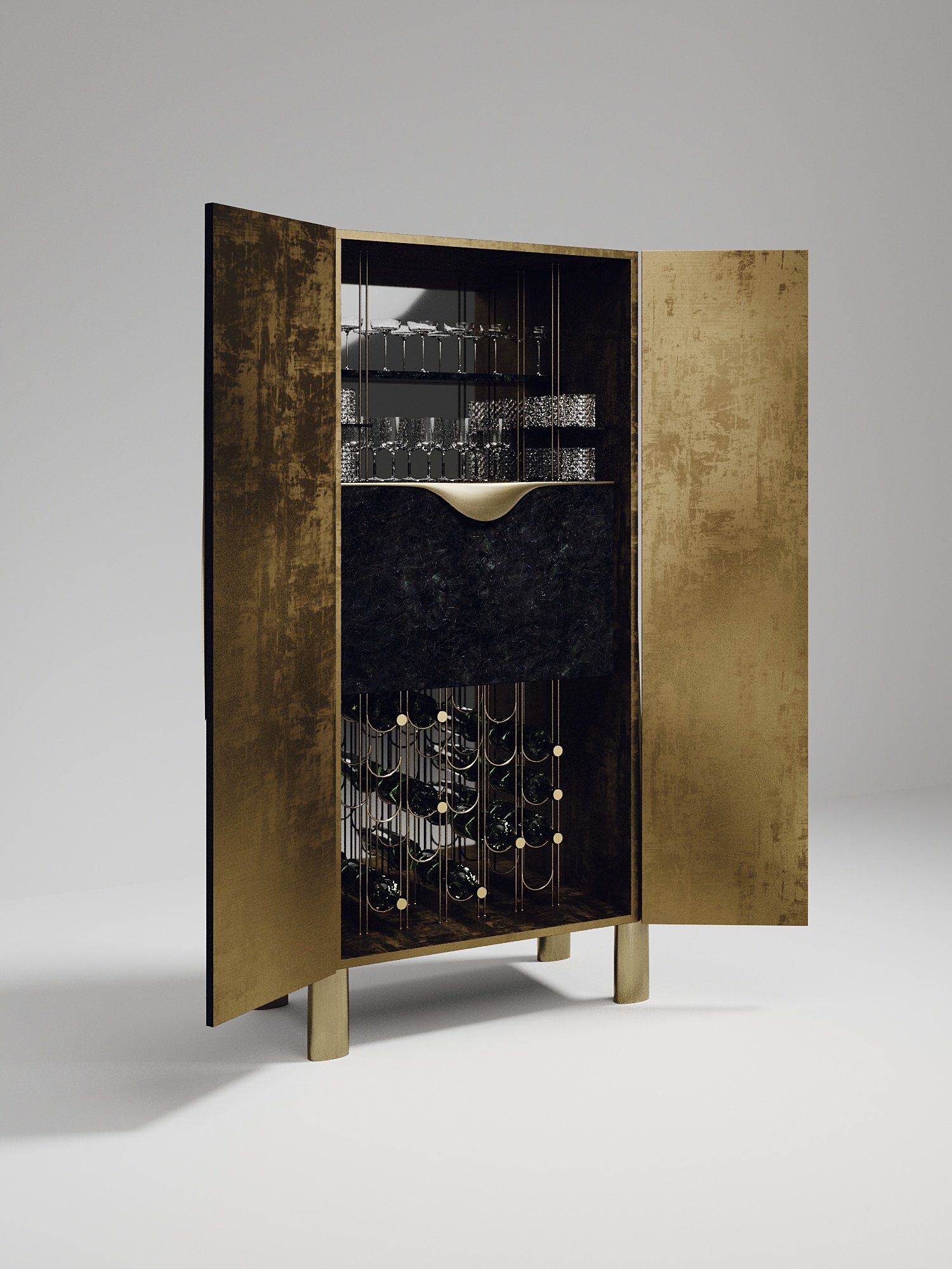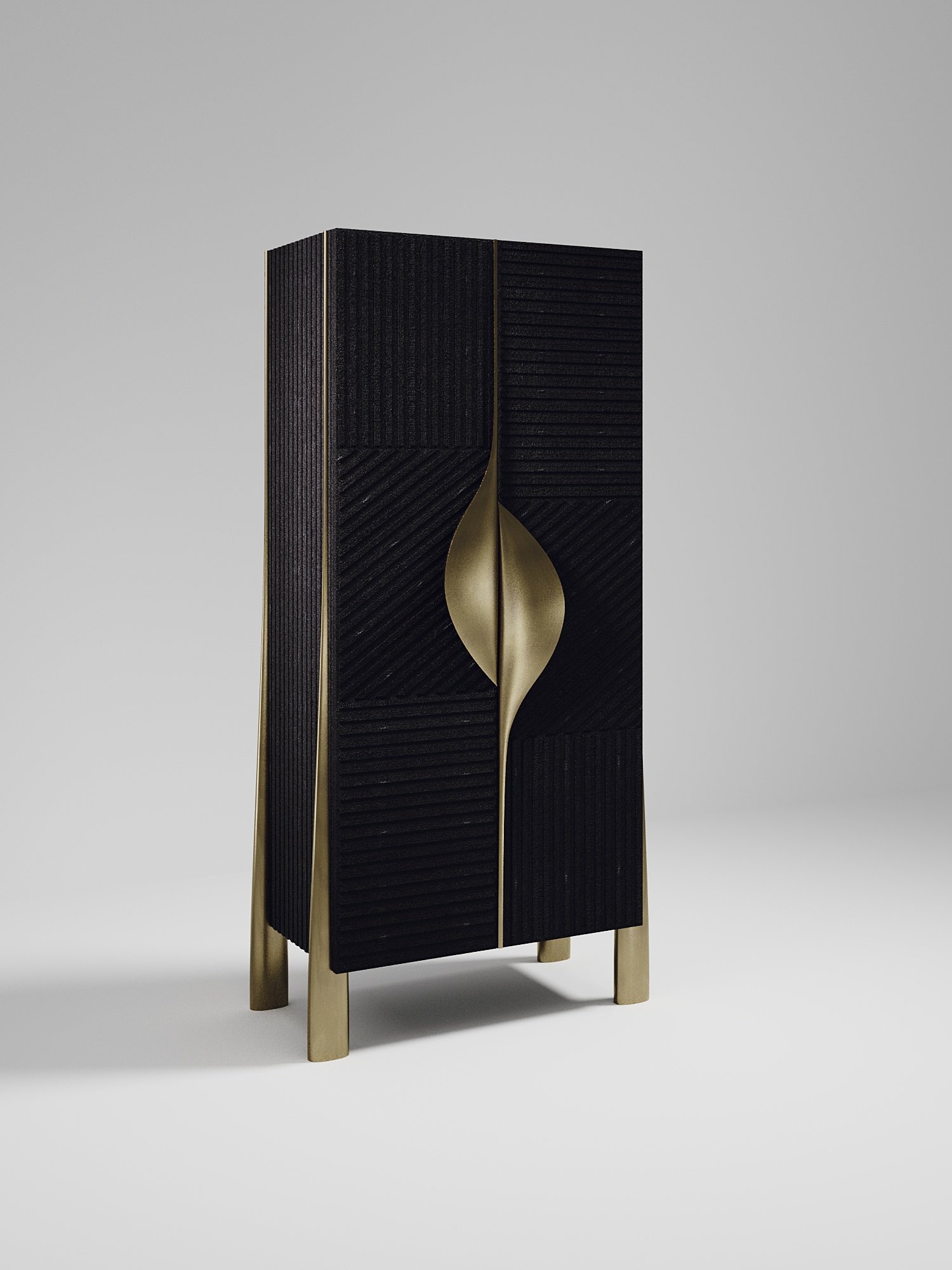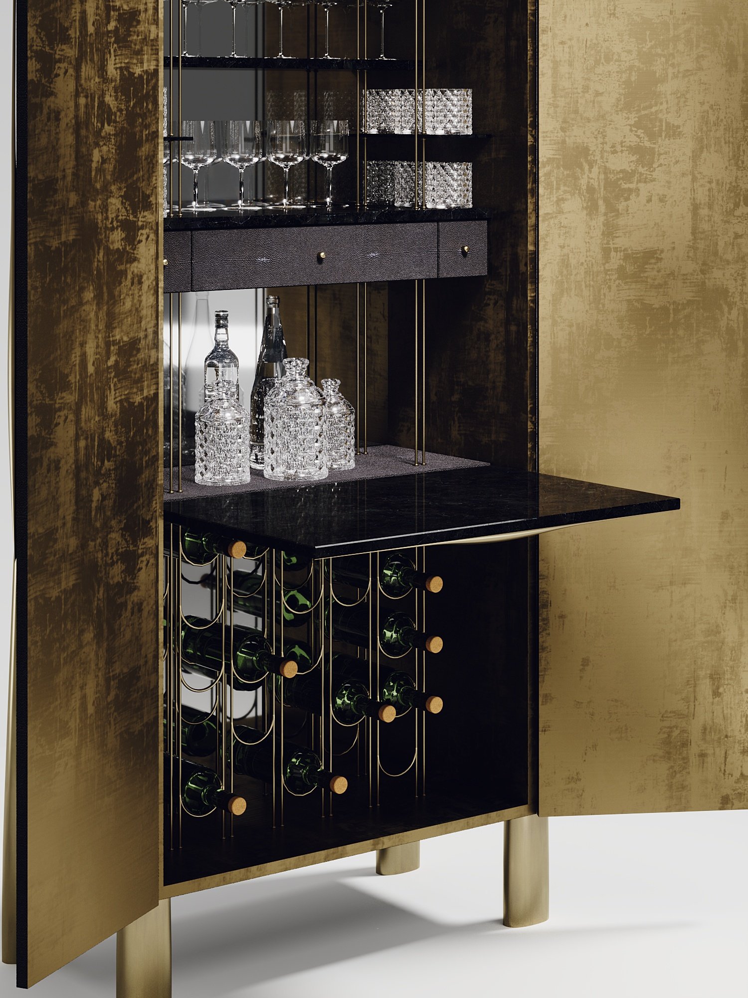The Wave Bar Cabinet by R&Y Augousti is one of a kind statement piece. The overall piece is inlaid in coal black shagreen, with the exterior hand-carved in an updated version of the signature Augousti "rhomboid" pattern. The door handles and legs are in a bronze-patina brass. The interior of the piece opens up to an ultra luxe bar. The interior includes a back wall lined in a mirror, a flap top compartment in shell, bronze-patina brass shelving and shagreen drawers. The walls are in gilded-gold. Available in other finishes and as a vanity cabinet