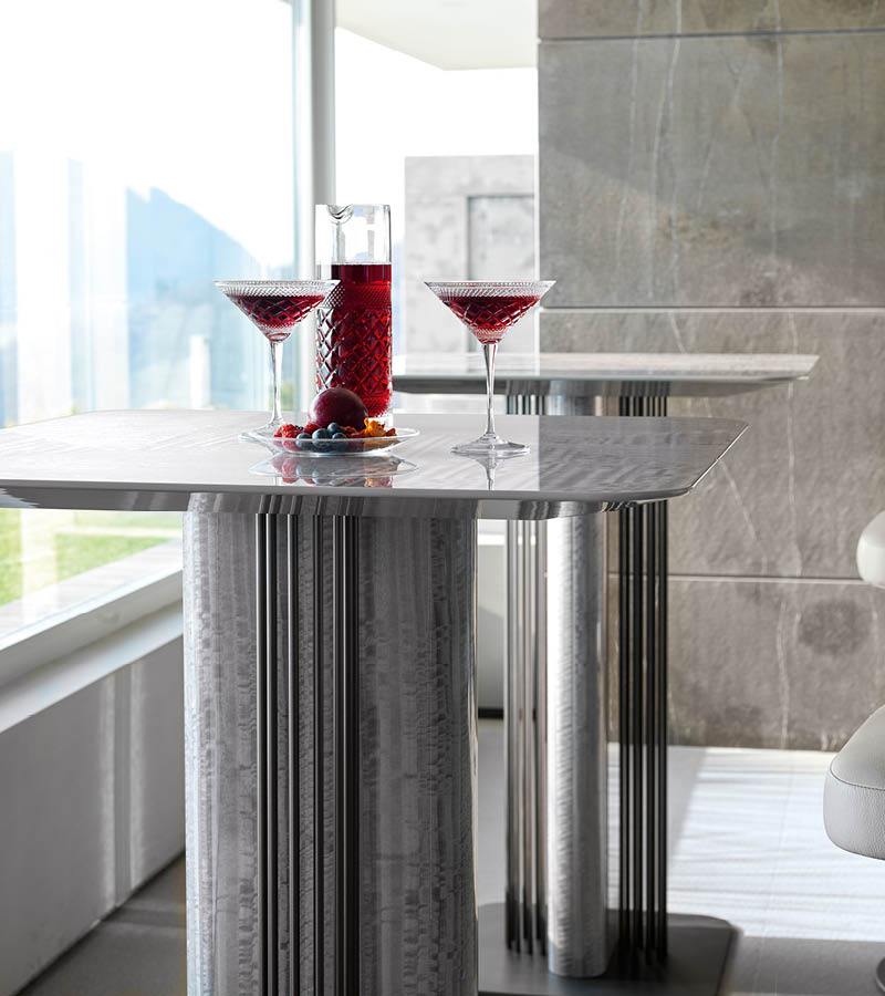 Bar table with top in inlaid Tasmanian curly Eucaliptus veneer with high gloss polyester finish. Base in combination of satin grey nickel stainless steel and Tasmanian curly Eucaliptus veneer with high gloss polyester finish.