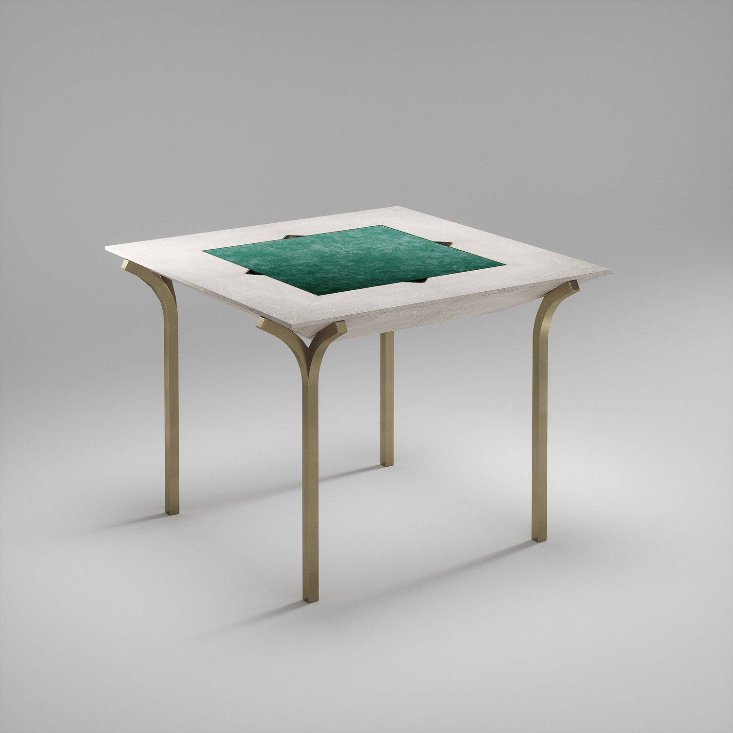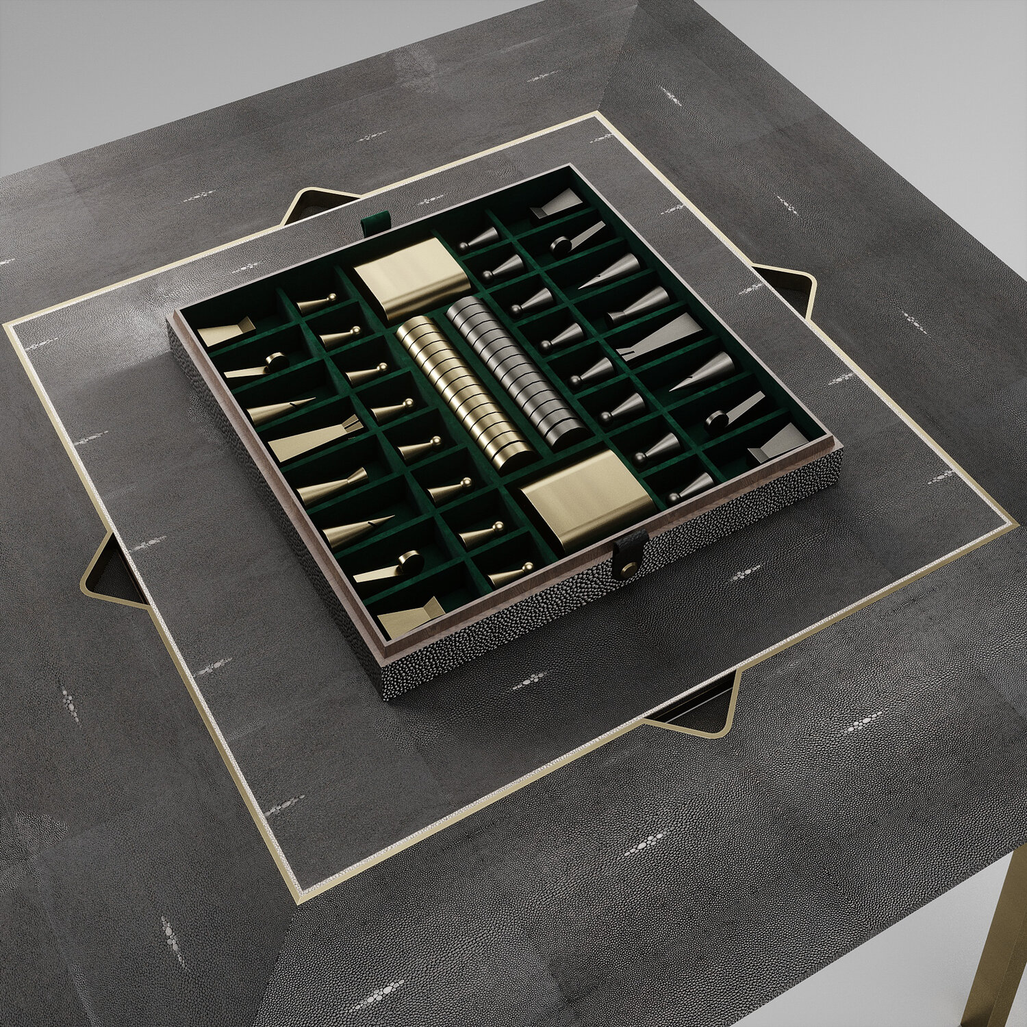 The 4 in 1 Marcel game table R&Y Augousti is a truly luxurious statement piece for your home. The clean lines of the overall piece in cream shagreen, accentuated by the sculptural and sleek bronze-patina brass legs make it versatile for any space. This piece includes a complete game package set with interchangeable boards that stack on top of each other in the centre of the table; one for chess, one for backgammon, a green velvet bard to play your favourite card games and a plain shagreen board if one were to use it as a beautiful centre piece.