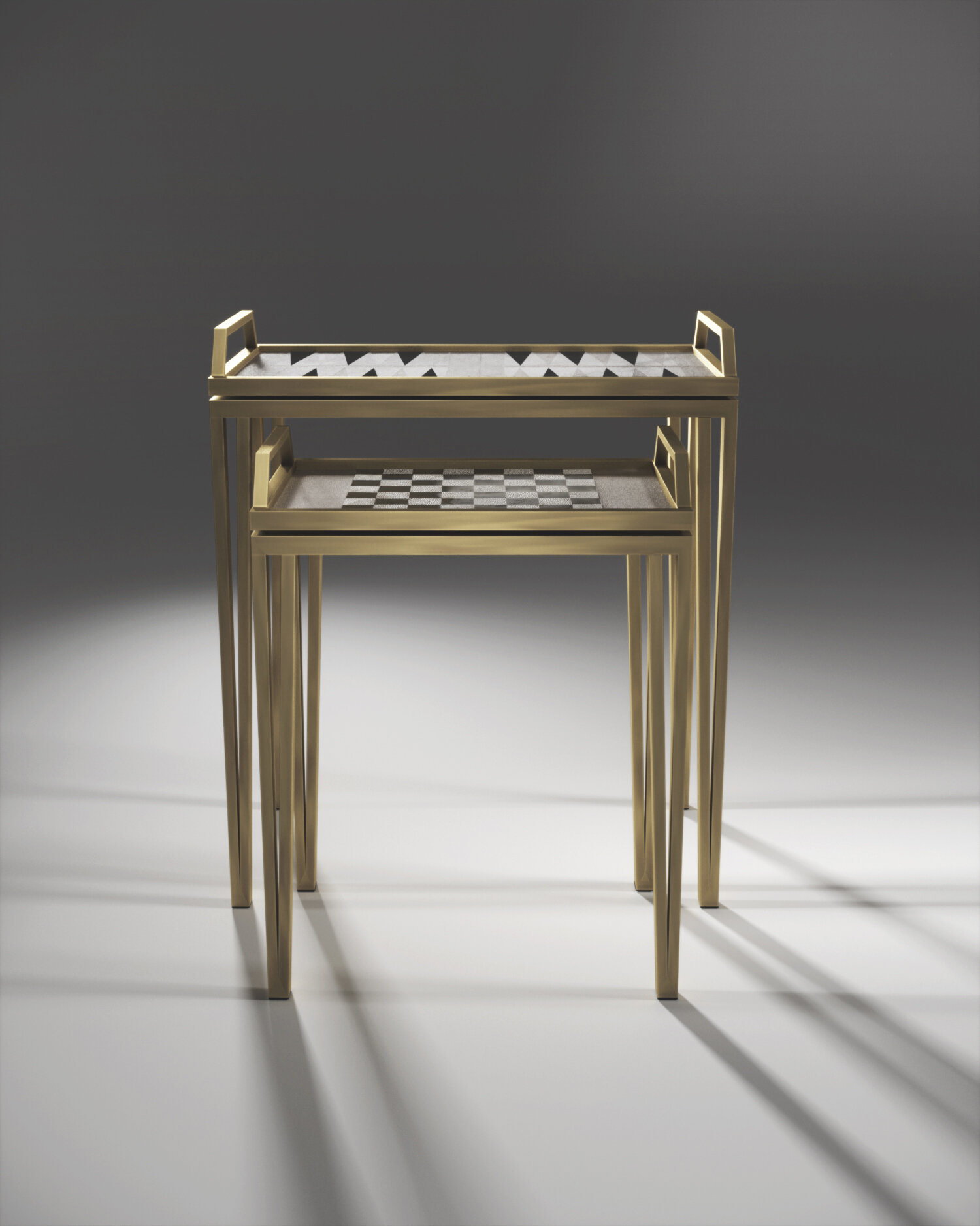 The set of 2 nesting game tables by R&Y Augousti inlaid in a mixture of cream shagreen, black pen shell and brass are the ultimate luxury piece of furniture. The larger size is for backgammon and the smaller nesting size for chess. Each tabletop is a removable tray to allow versatility to the overall piece. Sold with all game chips and accessories needed for chess and backgammon. Tables can be purchased individually on request. Also available in black metal. Also done as a plain shagreen side table.